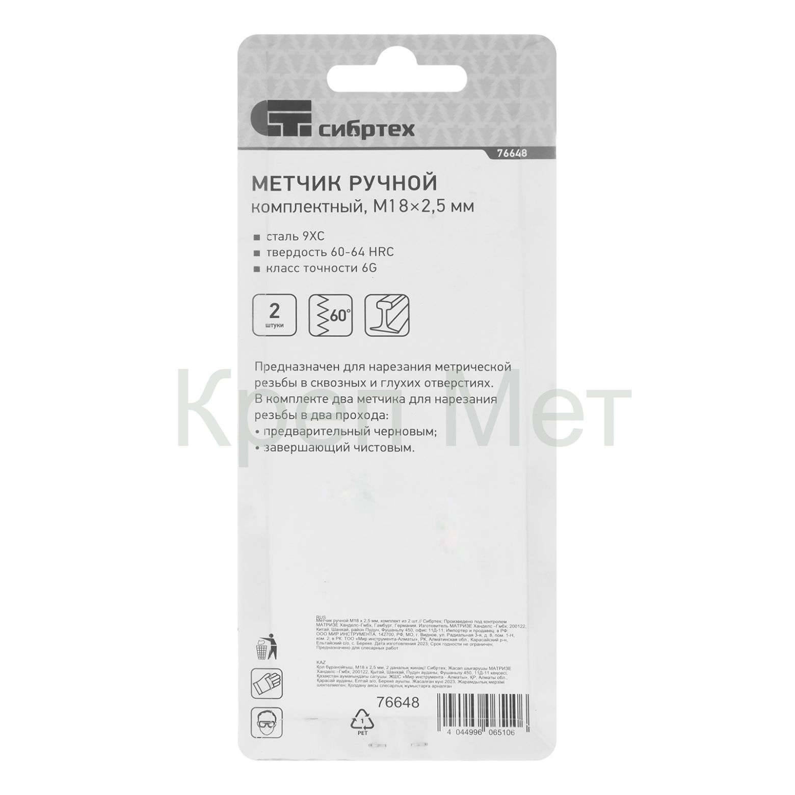 - Метчик ручной М18 х 2.5 мм, комплект из 2 шт Сибртех