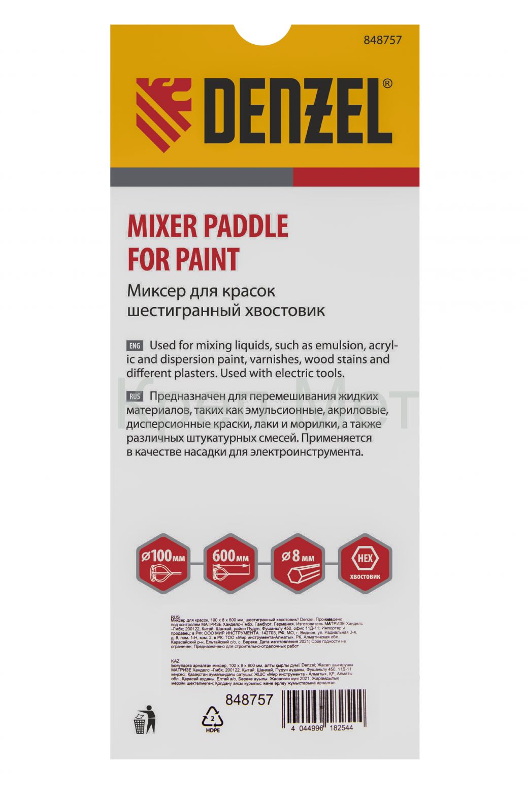 - Миксер для красок, 100 х 8 х 600 мм, шестигранный хвостовик Denzel