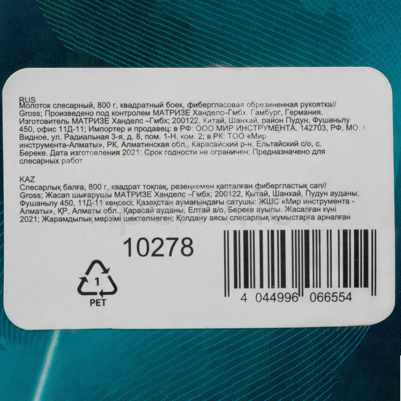 - Молоток слесарный, 800 г, квадратный боек, фибергласовая обрезиненная рукоятка Gross