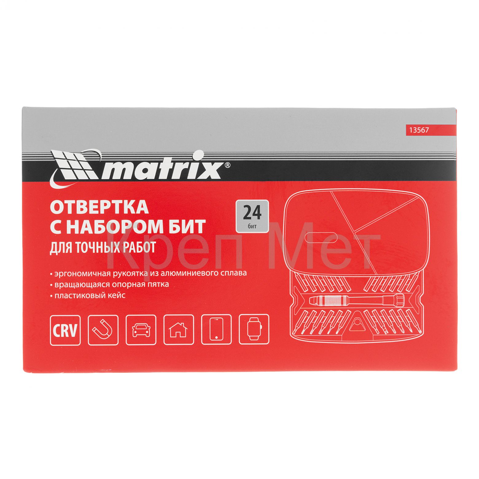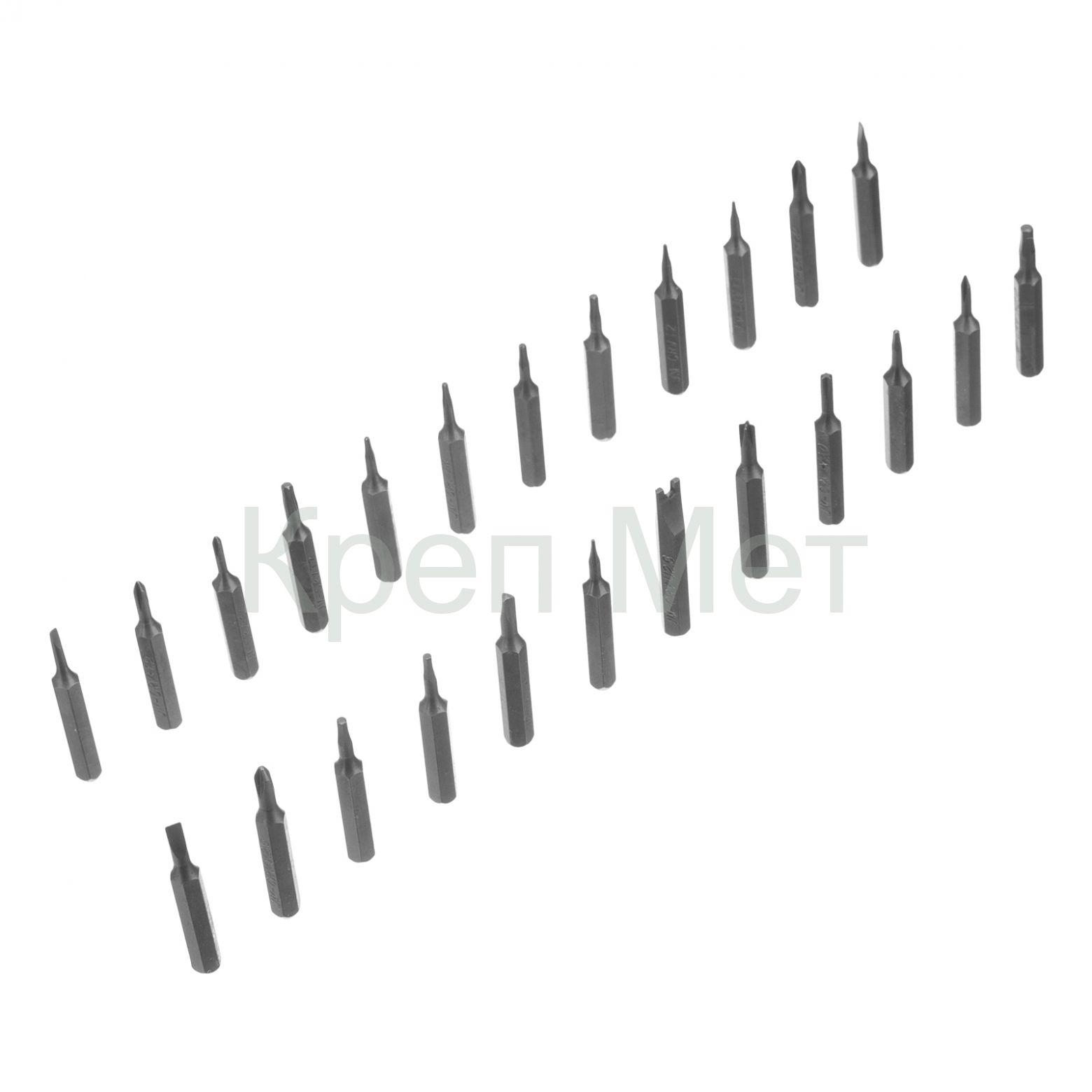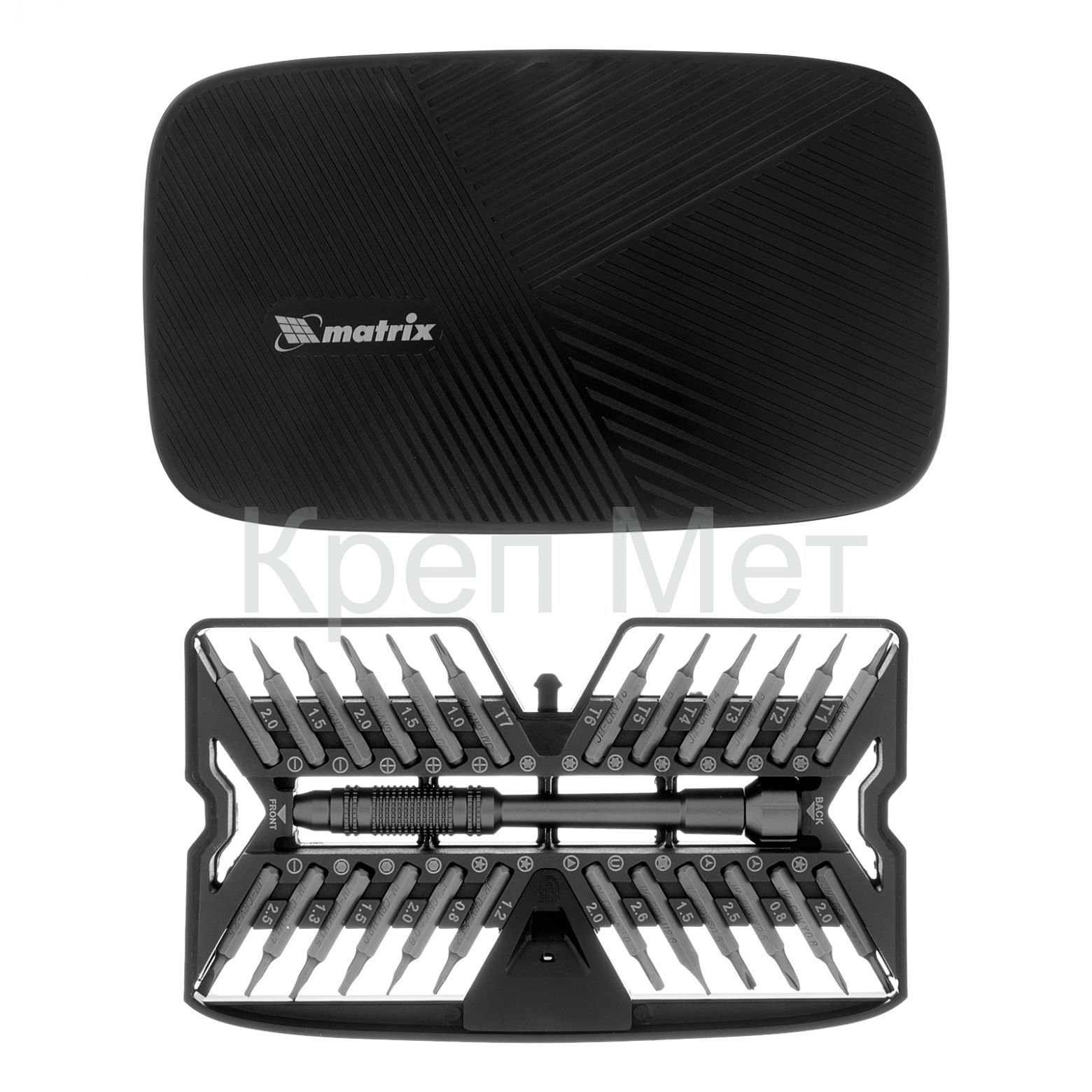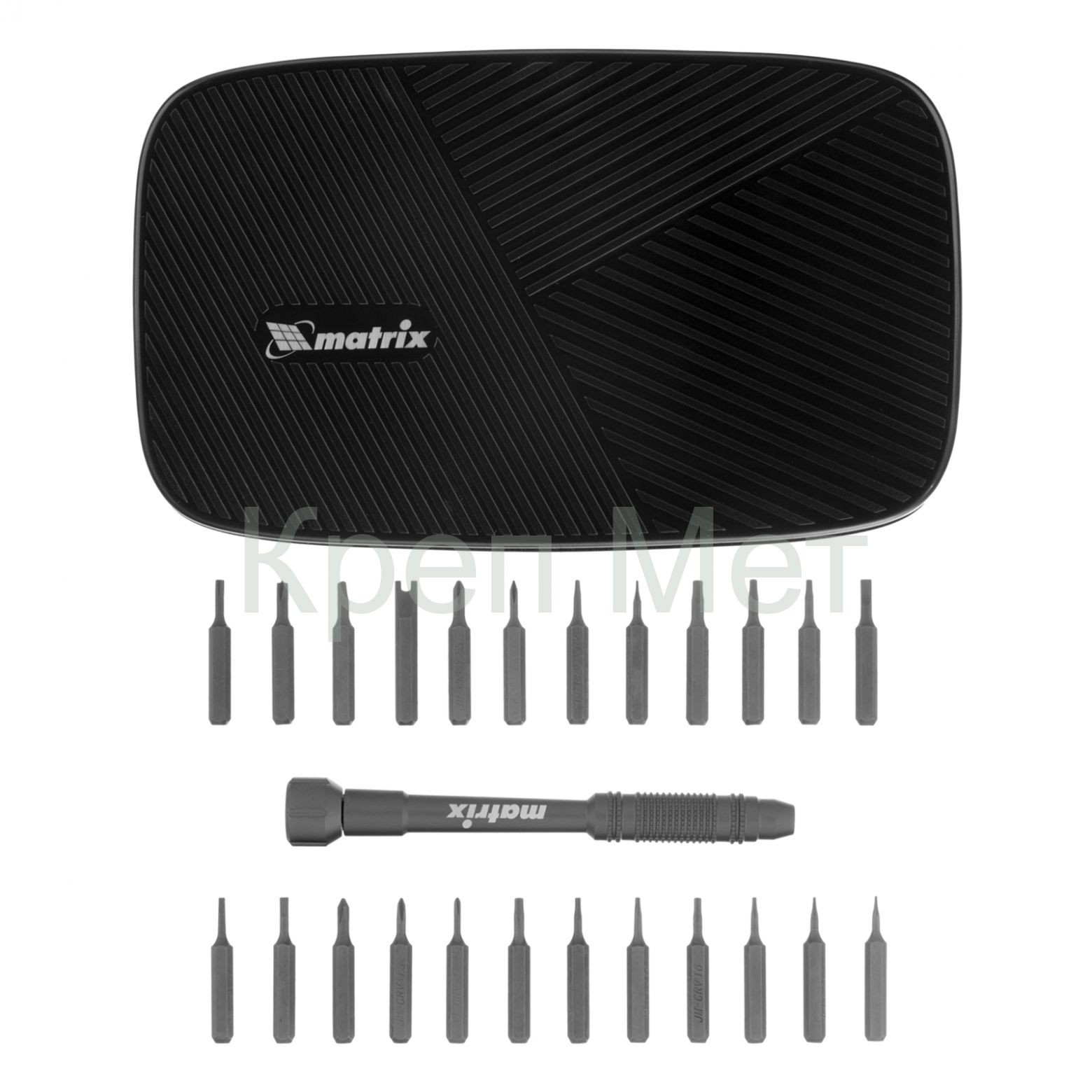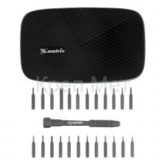 Набор для точных работ 26 в 1 Matrix 13567 содержит 24 биты с наконечниками PH, SL,T, H, Str, Y, St, TR, U, отвертку и пластиковый кейс. С его помощью можно отремонтировать очки, игрушки, портативную и бытовую технику и т.д.
