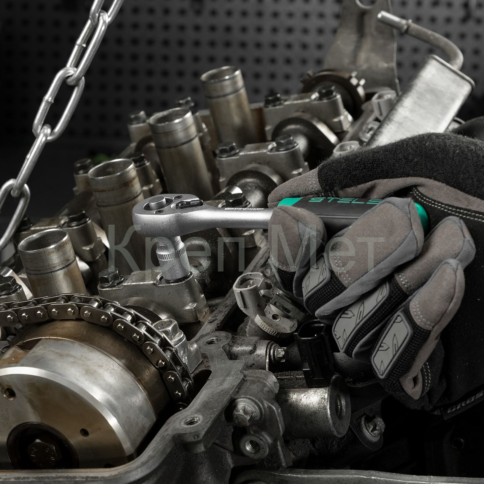 - Комфортная работа в труднодоступных местах — в набор входят ключи-трещотки с 72 зубьями, рабочий шаг составляет всего 5°.