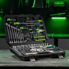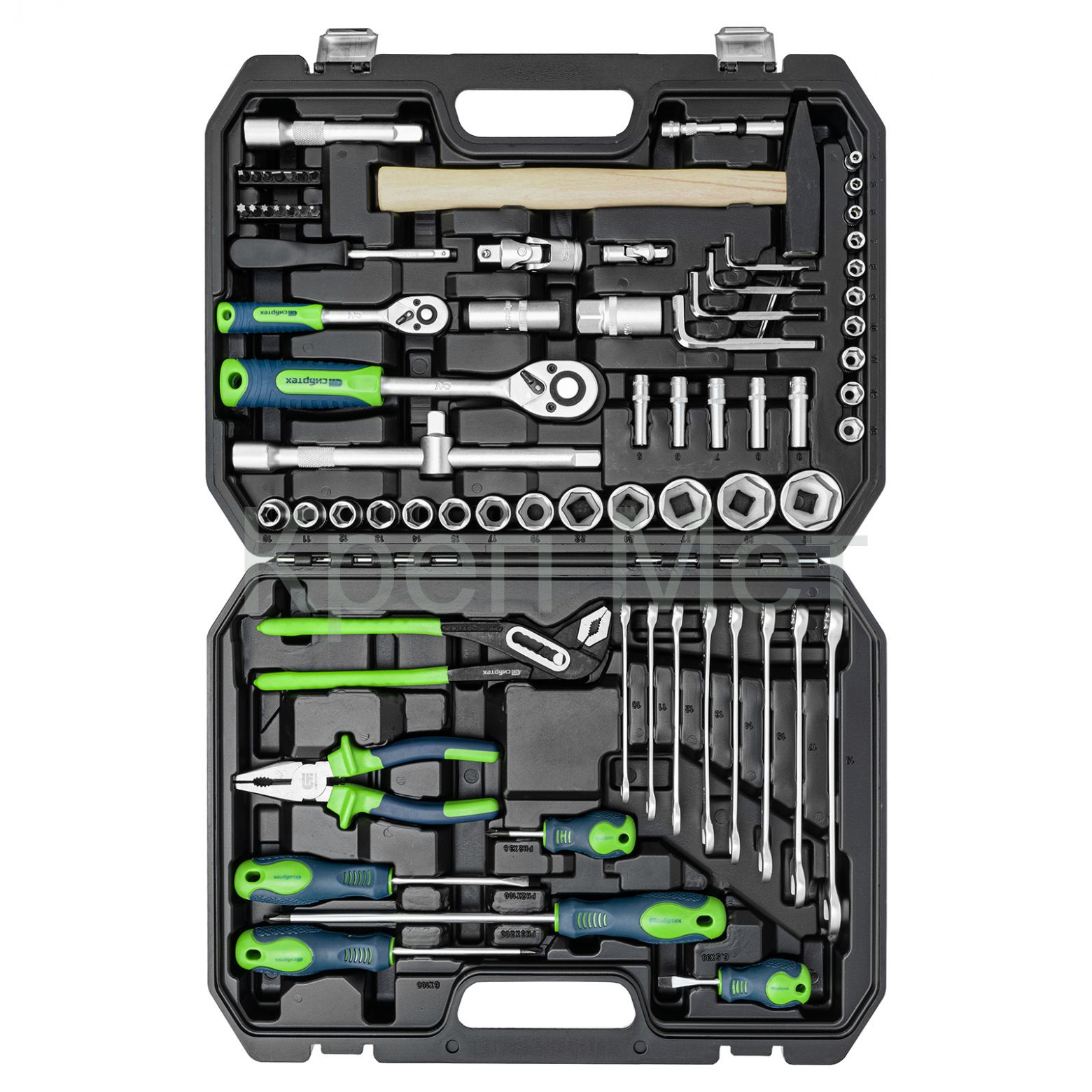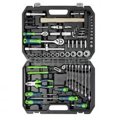 Набор инструментов Сибртех 13394 упакован в пластиковый кейс и состоит из 76 предметов с присоединительным размером 1/2" и 1/4", предназначенных для монтажа и демонтажа резьбового крепежа с разными типами шлицев, а также для ударных и других слесарно-монтажных работ. В комплект поставки входят карданы, удлинители и переходники, облегчающие работу в труднодоступных местах. Набор используется для ремонта автомобилей, а также полезен в быту.