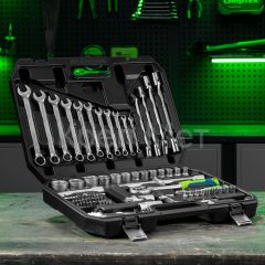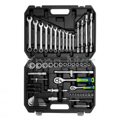 Набор инструментов Сибртех 13396 упакован в пластиковый кейс и состоит из 89 предметов с присоединительным размером 1/2" и 1/4", предназначенных для монтажа и демонтажа резьбового крепежа с разными типами шлицев. В комплект поставки входят карданы, удлинители и шарнирные ключи, облегчающие работу в труднодоступных местах. Набор используется для ремонта автомобилей, а также полезен в быту.