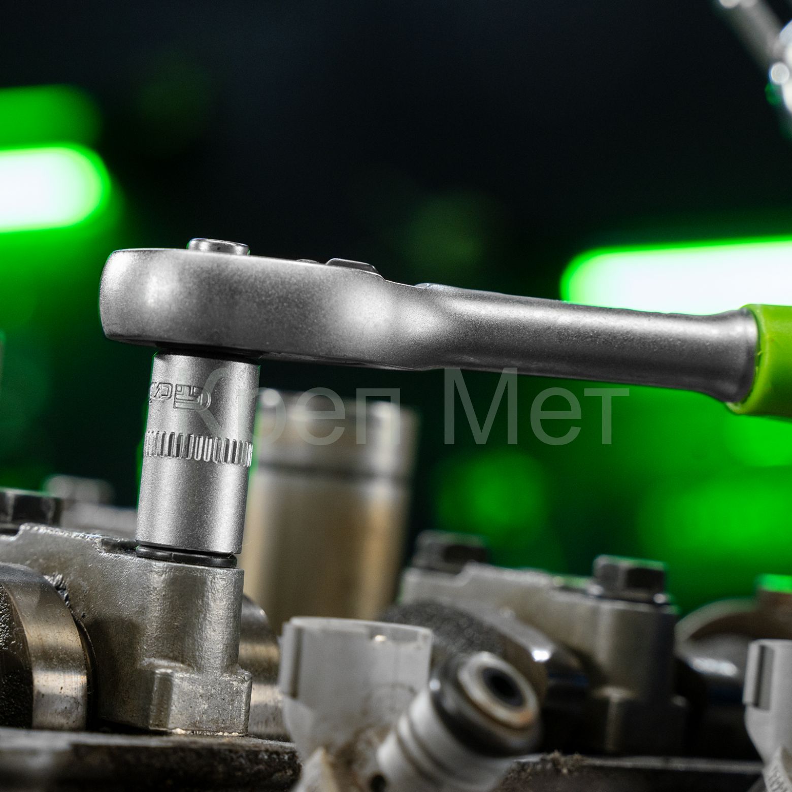 - Комфортная и эффективная работа — ключи-трещотки с 45 зубьями оснащены механизмом быстрого сброса, переключателем реверса с металлическим флажком и двухкомпонентной рукояткой.