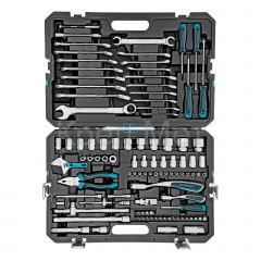Набор инструментов Gross 14151 включает в себя 101 предмет, в том числе ключи-трещотки из стали CrV со 120 зубьями, с присоединительным размером 1/4" и 1/2", а также разводной ключ и плоскогубцы. Инструменты используются для монтажа и демонтажа резьбовых соединений, плоскогубцы служат для захвата и удержания деталей. Воротки, удлинители и карданные шарниры облегчают работу в стесненных условиях. Набор пригодится водителям, сотрудникам автосервисов, а также домашним мастерам.
