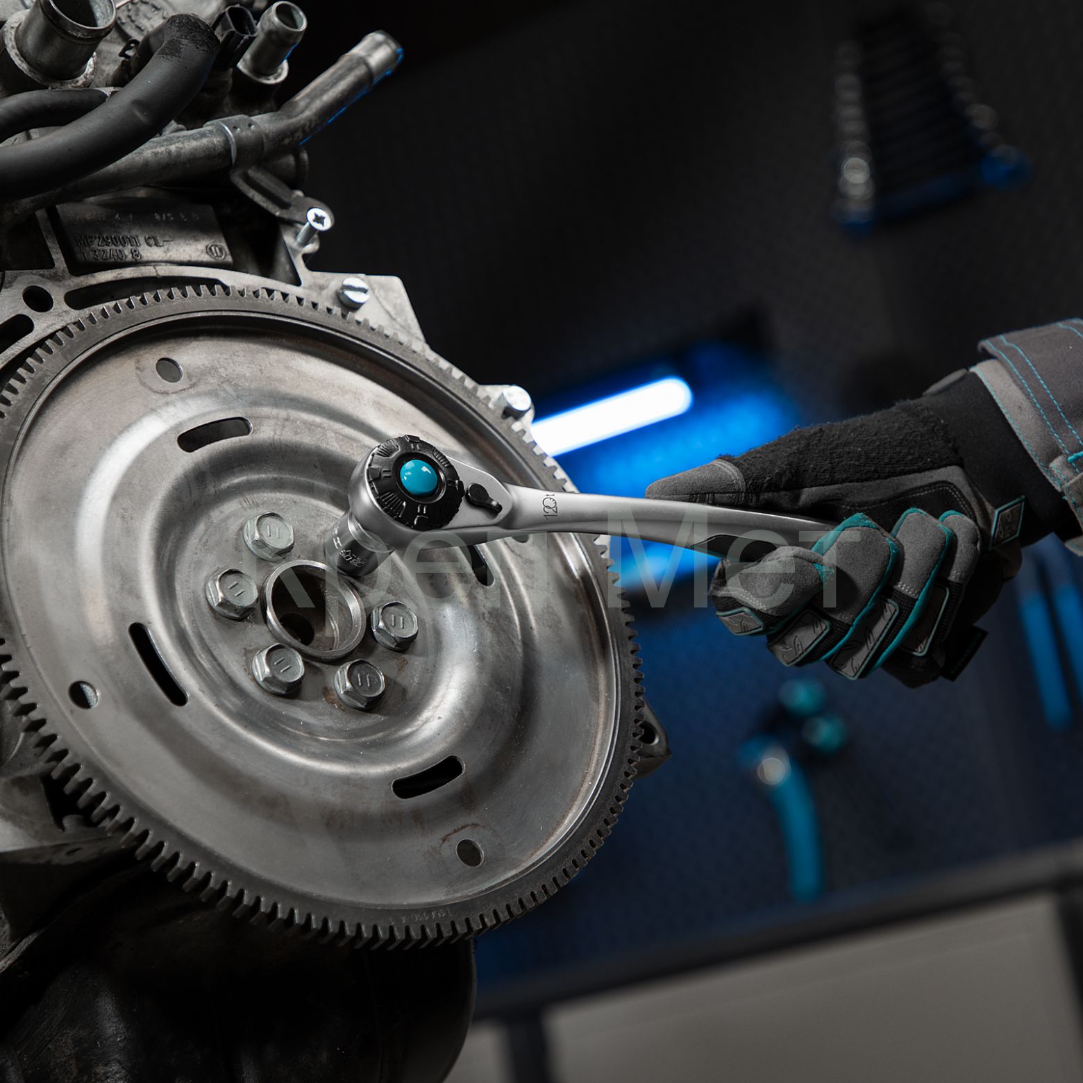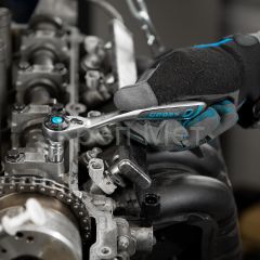 - Удобная работа с труднодоступными крепежами — гаечные ключи имеют изогнутый корпус, шаг трещоток составляет всего 3°.