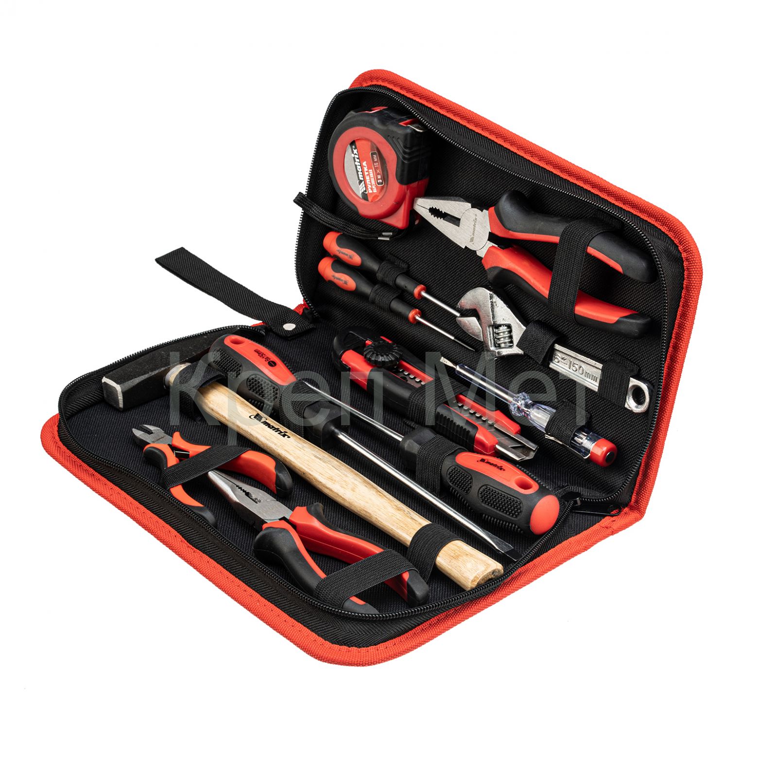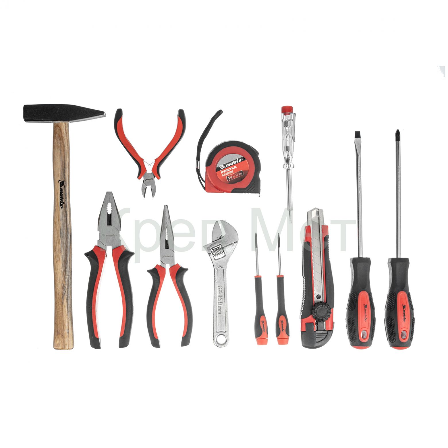 Набор Matrix 13562, 12 предметов, будет полезен как частным мастерам, так и профессионалам для проведения слесарно-монтажных работ. Он включает отвертки для монтажа/демонтажа резьбовых соединений, в том числе и мелких, разводной ключ для болтов и гаек, нож для резки плотных материалов, рулетку для проведения замеров, молоток, кусачки, и тестер напряжения.