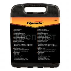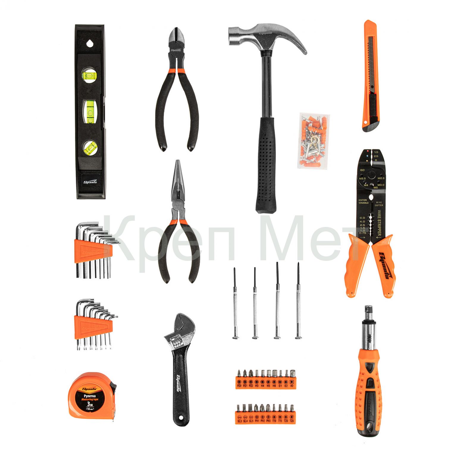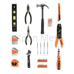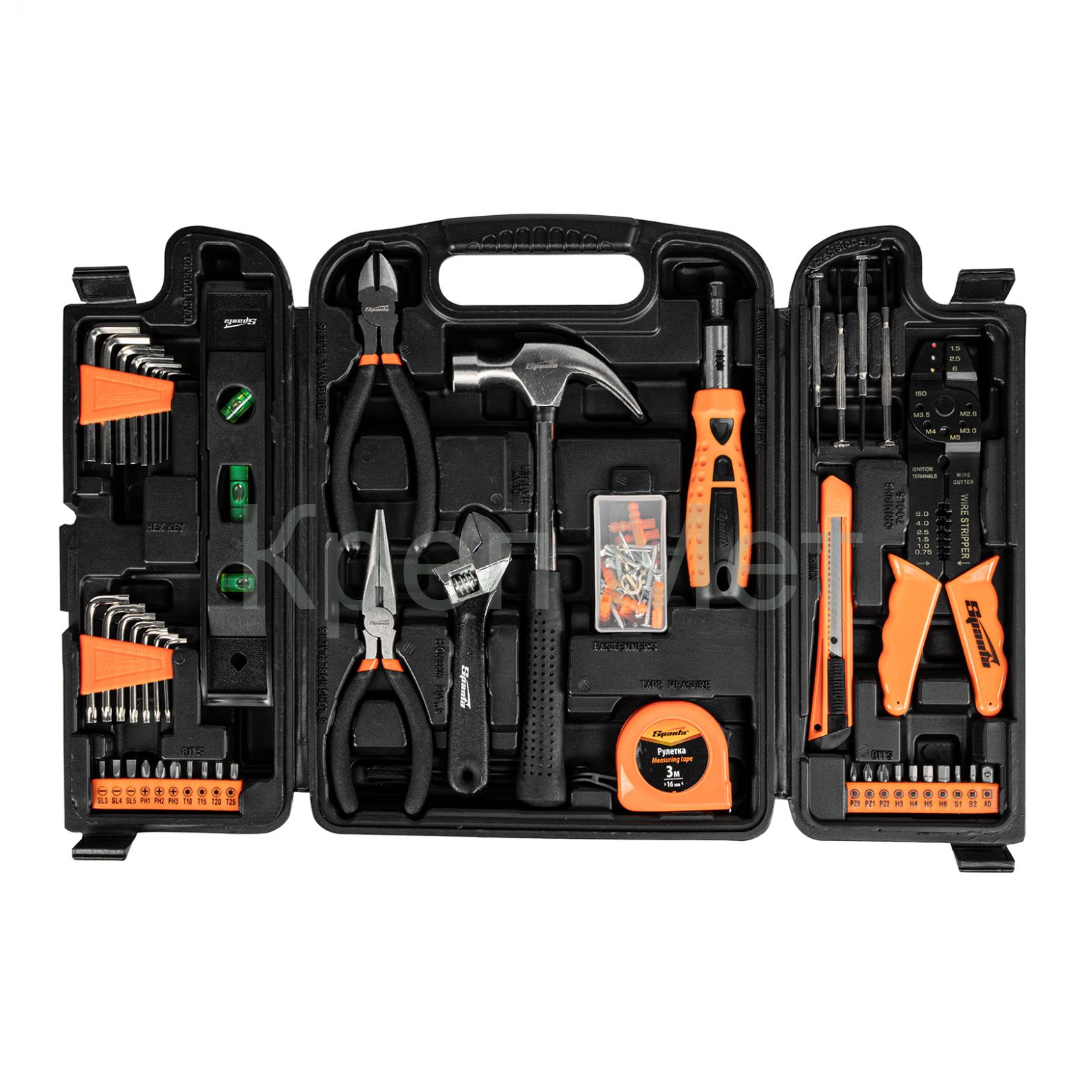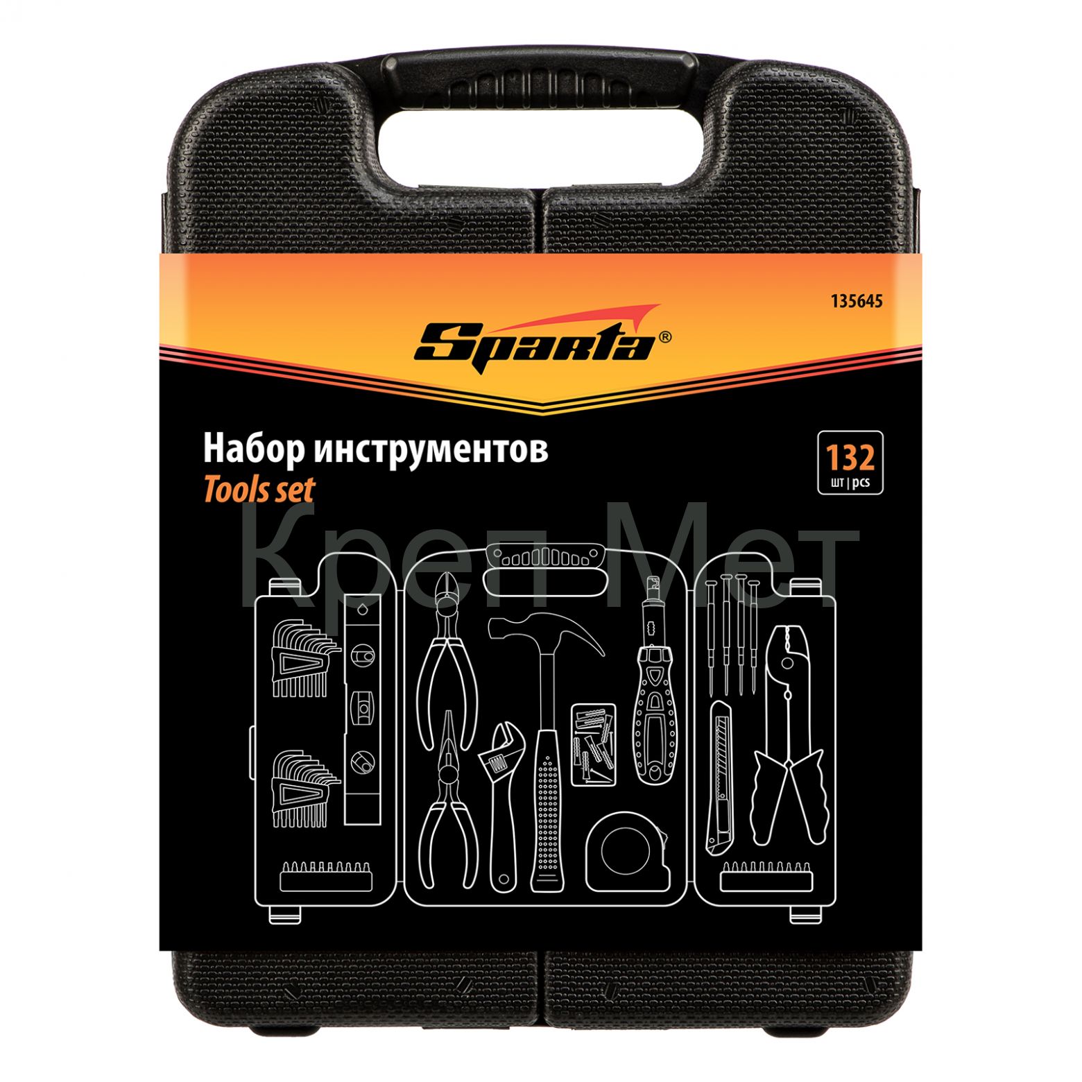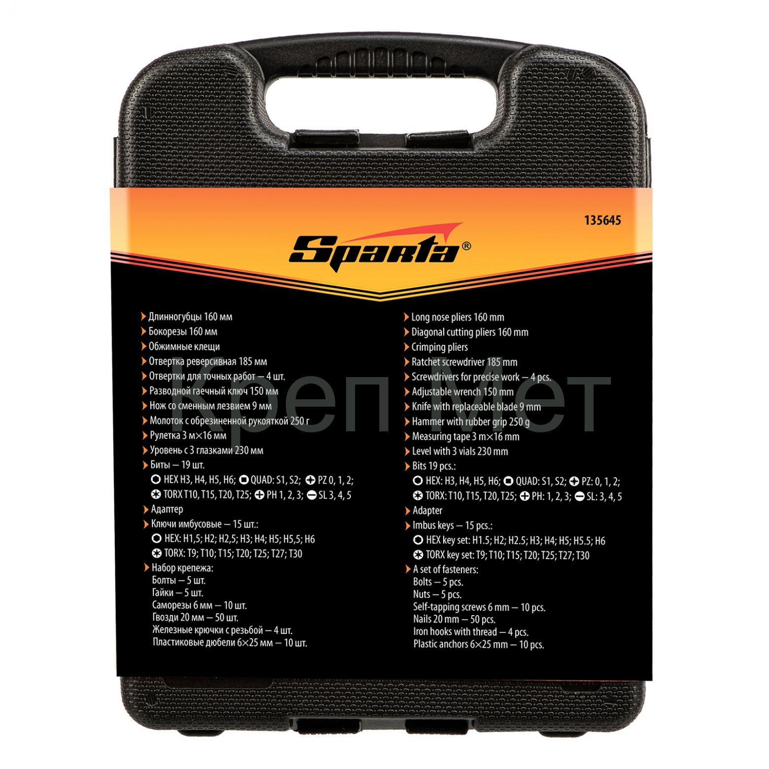 Набор инструментов Sparta 135645 включает в себя 132 предмета для бытового применения: обжимные клещи, отвертки, в том числе для точных работ, молоток-гвоздодер, бокорезы, строительный уровень, разводной и имбусовые ключи, биты-вставки с адаптером, длинногубцы, рулетку, канцелярский нож, а также набор крепежа. Инструменты оптимально подходят для выполнения слесарно-монтажных работ дома или на даче.