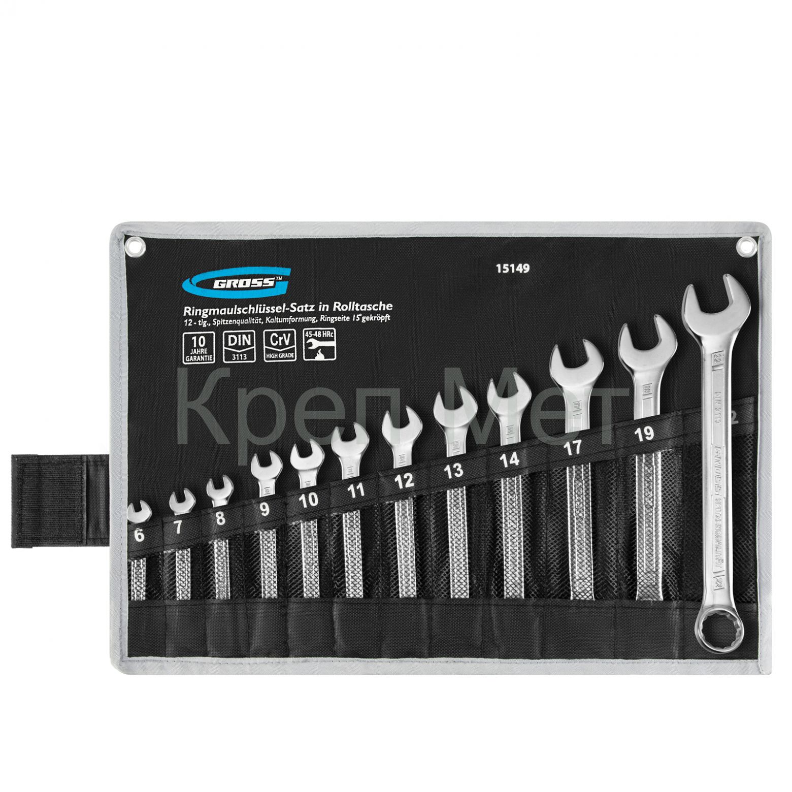 Набор комбинированных ключей Gross 15149 из 12 шт. размером от 6 до 22 мм, холодный штамп, — комплект ручных слесарно-монтажных инструментов из стали CrV, позволяющих закручивать и откручивать гаечные и болтовые соединения. Кольцевой зев каждого ключа имеет 12-гранную рабочую поверхность и крепко удерживает крепеж, не повреждая его. Ключи используются при ремонте автомобилей, сборке техники, будут полезны и в быту.