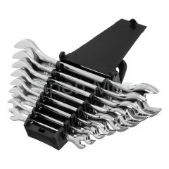 Набор Matrix Elliptical 15238 включает в себя 8 рожковых ключей из стали CrV с зеркальным хромированием и предназначен для закручивания и откручивания резьбовых соединений с шестигранным профилем и размером головки от 6 до 22 мм. Ключи удобны для манипуляций в ограниченном пространстве, т. к. у каждого из них губки расположены под углом к рукоятке. Набор будет полезен при проведении монтажных, сантехнических работ, для ремонта автомобилей или бытовой техники, также пригодится в быту.