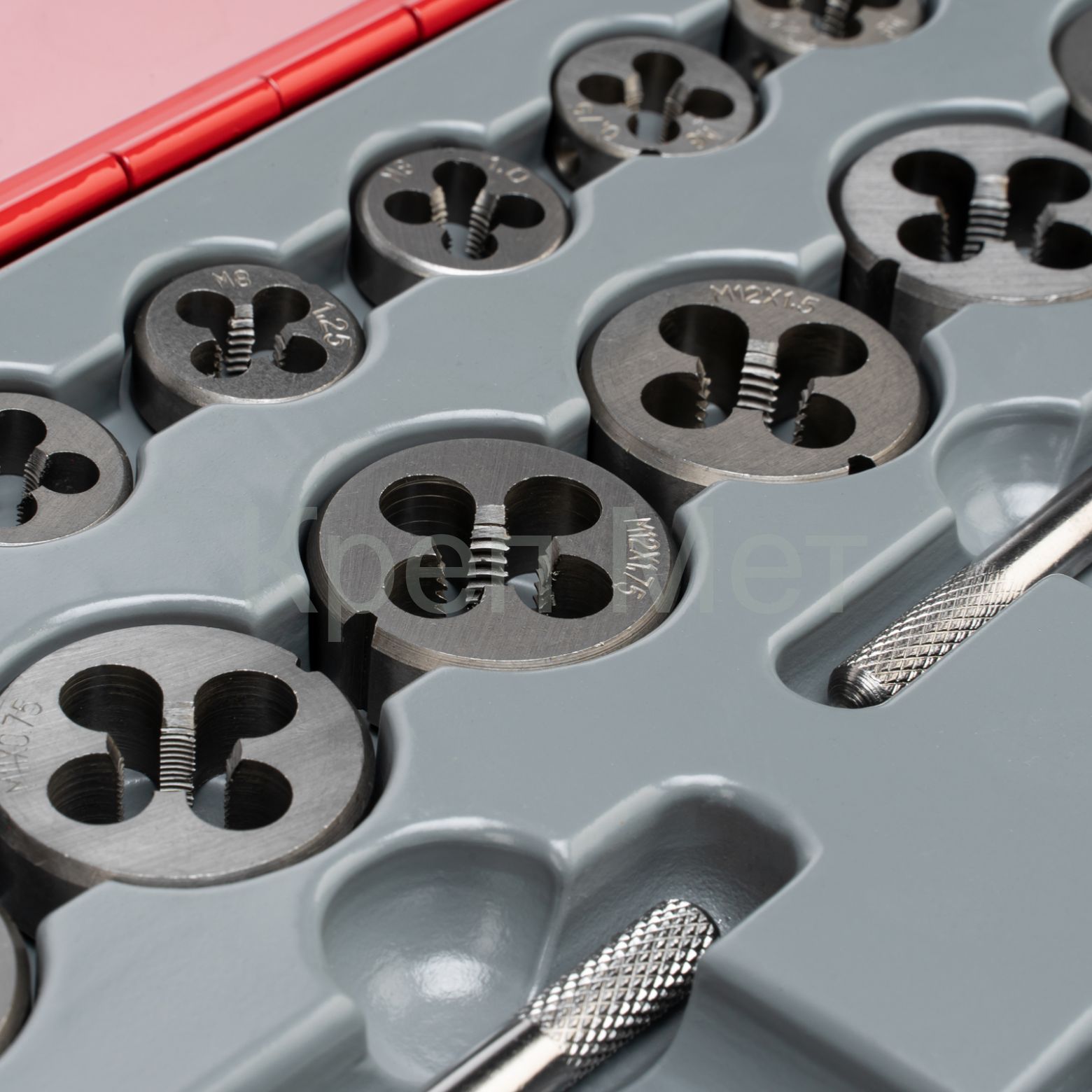 - Быстрый поиск нужного инструмента — на каждый предмет нанесено обозначение размера и шага резьбы.