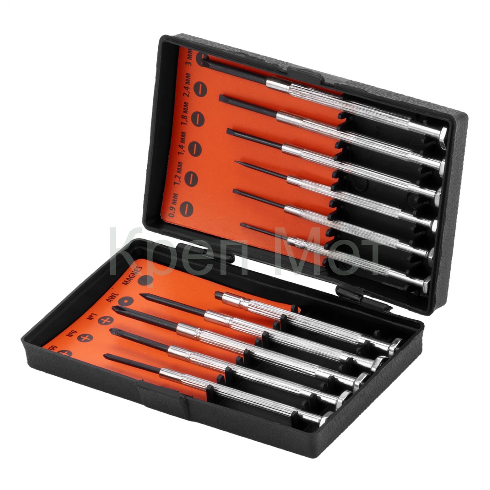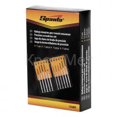 Набор отверток Sparta 133605, 11 предметов, используется для точной механики при осуществлении монтажа/демонтажа микровинтов со шлицами SL и PH. Он рассчитан на несложные бытовые работы, может применяться в частной мастерской. С помощью набора легко ремонтировать мелкие бытовые приборы, очки, часы и т.д.