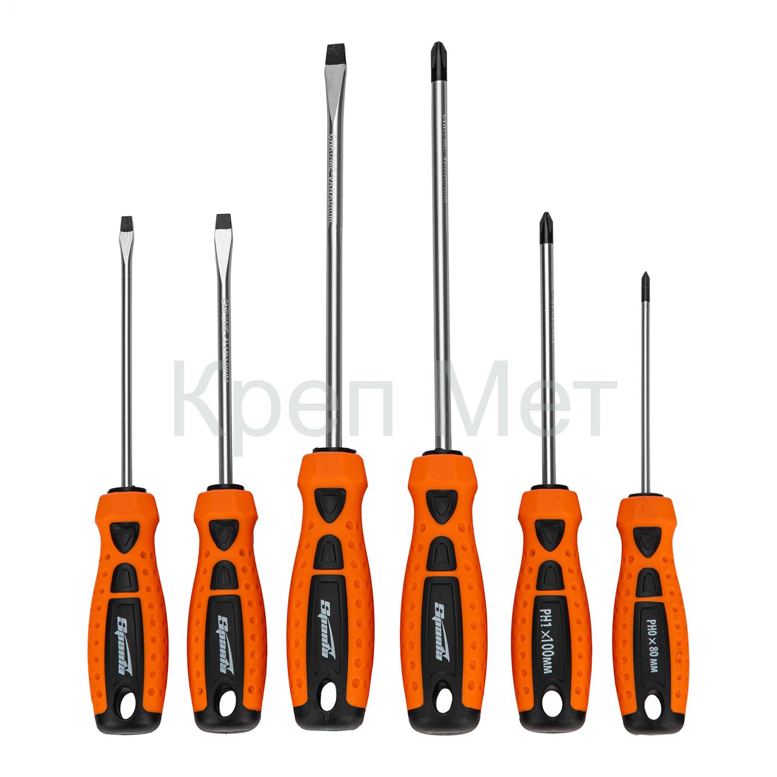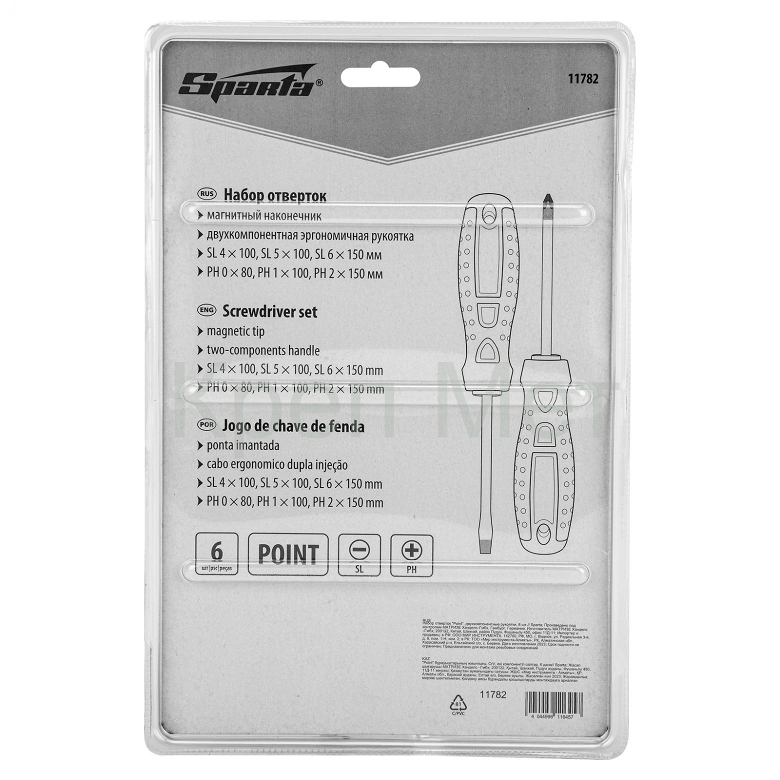 Набор отверток Sparta «Point» 11782 с двухкомпонентными рукоятками, CrV, состоит из 6 инструментов наиболее распространенных типоразмеров. Применяется для закручивания и откручивания крепежных элементов с профилем SL и PH. Набор рассчитан на бытовое использование, осуществление несложных монтажных и ремонтных работ. Отвертками можно работать в труднодоступных местах, т.к. комплект включает инструменты как с коротким — 75 мм, так и с длинным стержнем 150 мм.