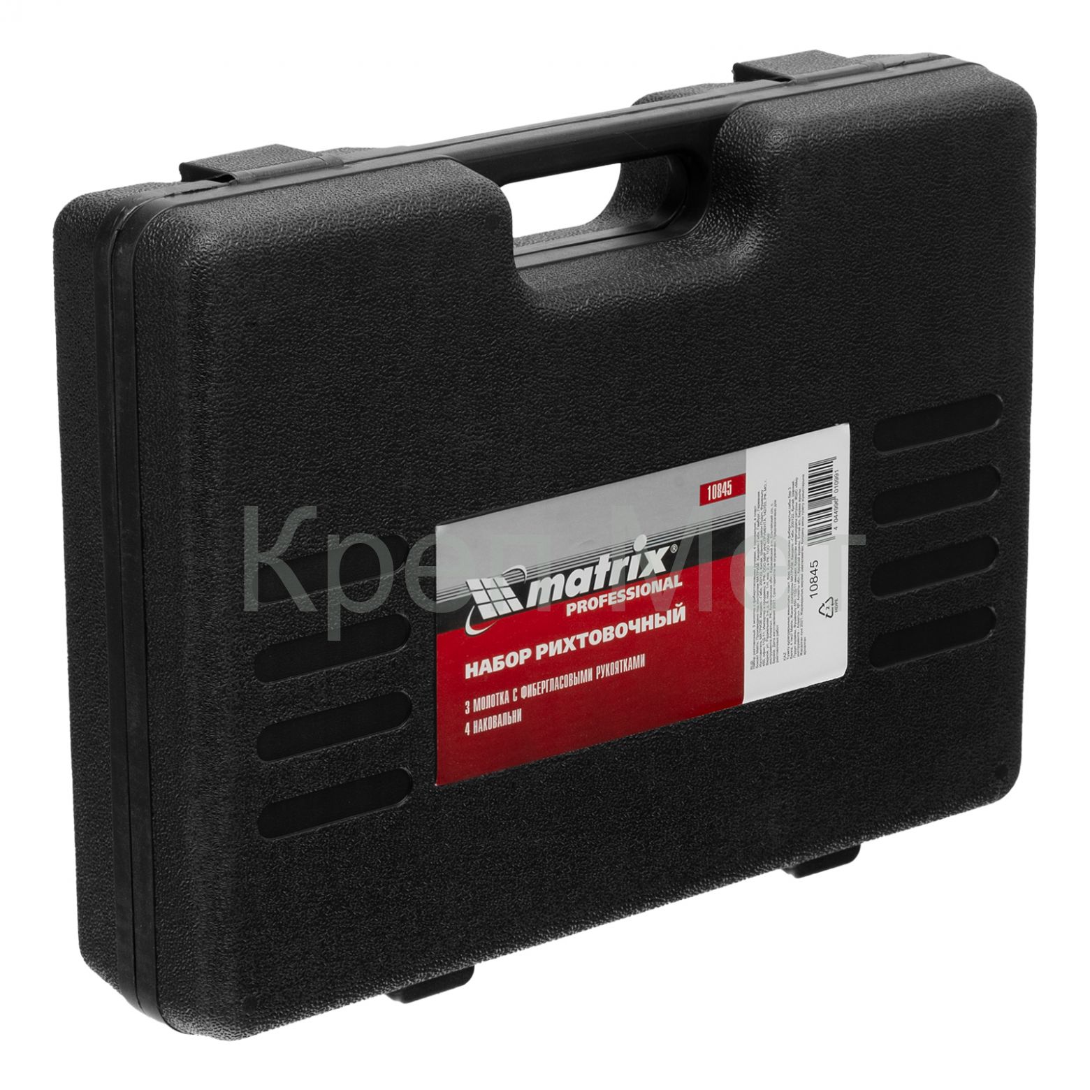 Рихтовочный набор Matrix 10845, включающий 3 молотка с фибергласовыми ручками и 4 наковальни, предназначен для исправления геометрии элементов автомобильного кузова. Наковальни и ударные головки имеют различную форму, что позволяет работать с деталями разной степени кривизны. Набор используется в автомастерских.