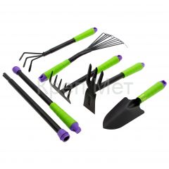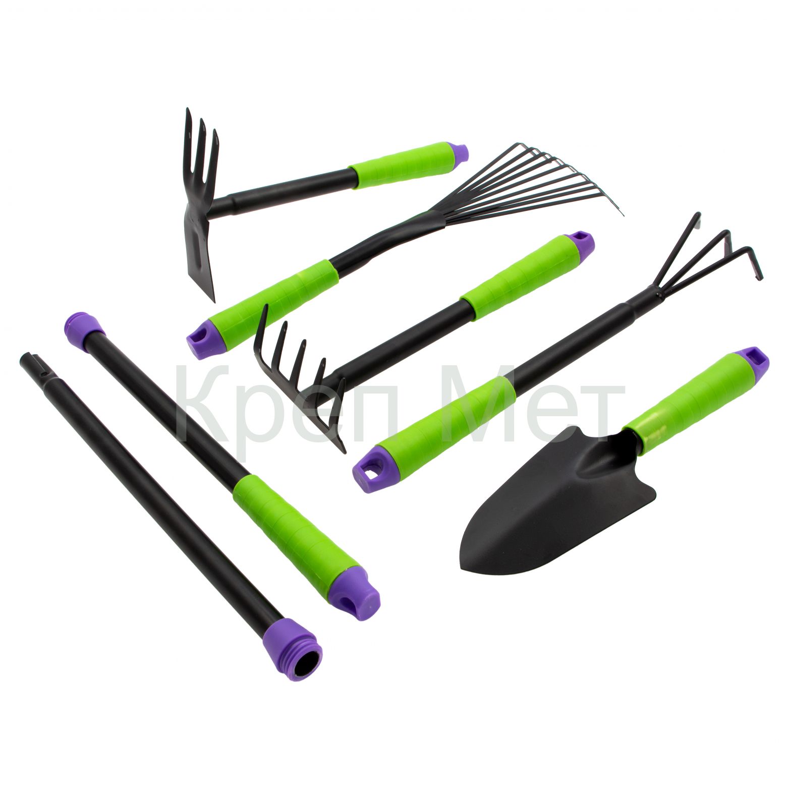 Набор Palisad CONNECT 63020 включает 7 предметов — садовые инструменты с пластиковыми рукоятками для вскапывания, прополки и рыхления почвы, а также сбора листвы и мусора. У каждого инструмента имеется ручка со съемным колпачком, которую можно удлинить при помощи входящих в комплект штанги и рукоятки, подобрав оптимальный для своего роста размер. Набор будет полезен во время работы на дачном участке.