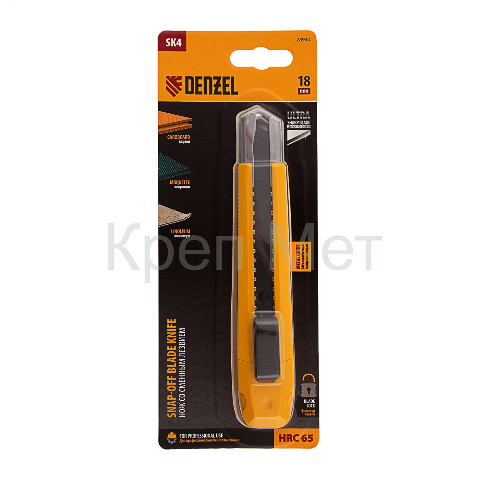 Нож, 18 мм, сменное лезвие, SK4, метал. направляющая, клипса, нажимной фиксатор Denzel
