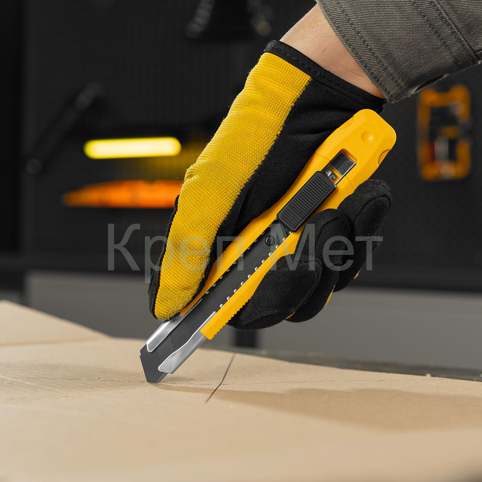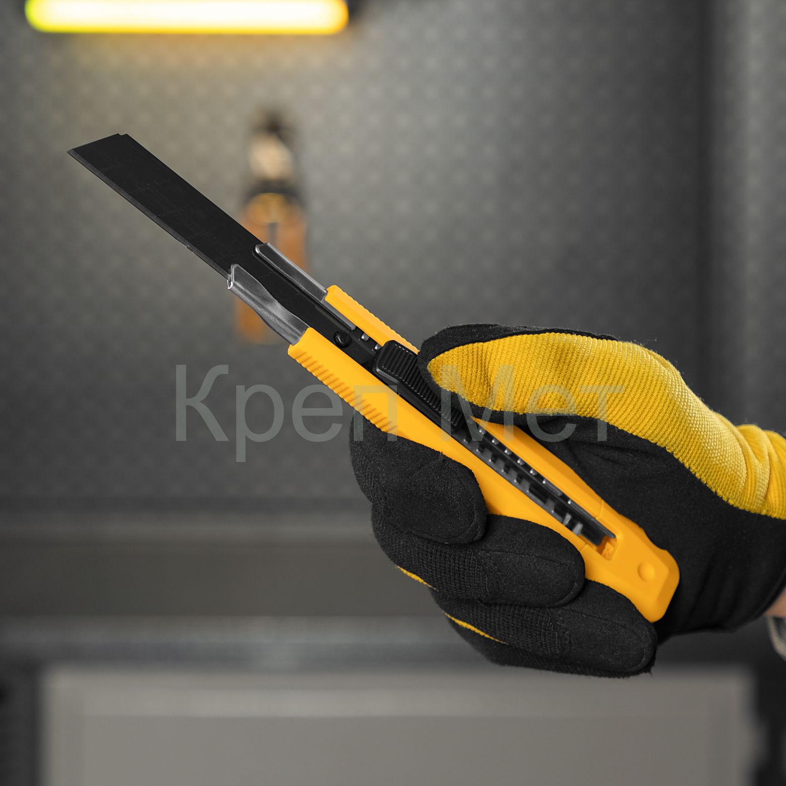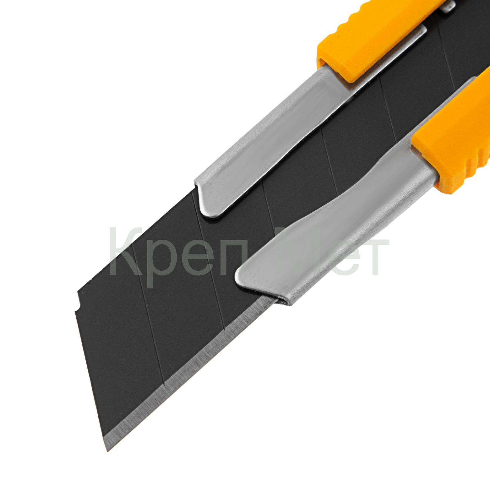 - Нож, 18 мм, сменное лезвие, SK4, метал. направляющая, клипса, нажимной фиксатор Denzel