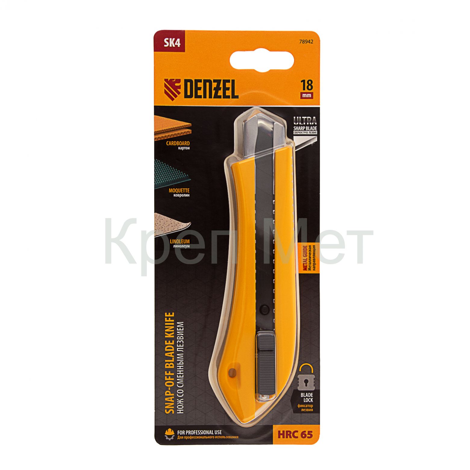Нож, 18 мм, сменное лезвие, SK4, метал. направляющая, нажимной фиксатор Denzel