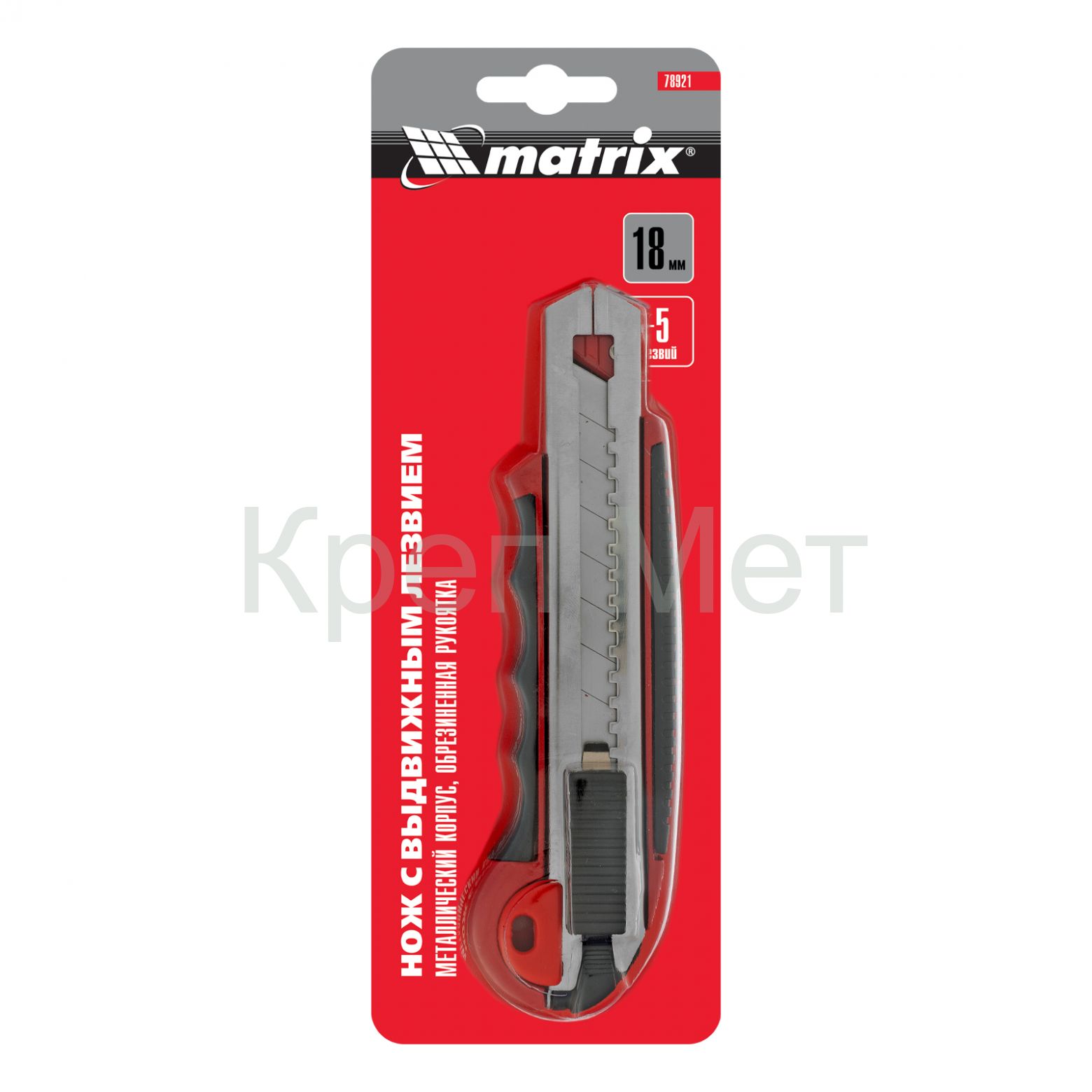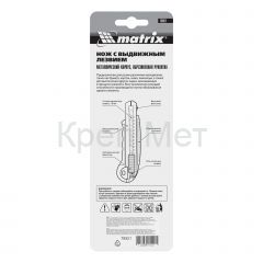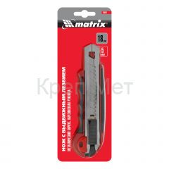Нож Matrix 78921 с выдвижным лезвием шириной 18 мм, металлической направляющей, обрезиненной ручкой и 5 лезвиями в комплекте, используется для резки отделочных материалов (обоев, линолеума), а также картона, бумаги, пленки, скотча. Выдвижное полотно закрепляется в рабочем положении автоматически, а металлическая направляющая придает прочность конструкции и обеспечивает долговечность инструмента. Предусмотрена возможность замены лезвий. Нож подходит как для бытового, так и для профессионального применения.