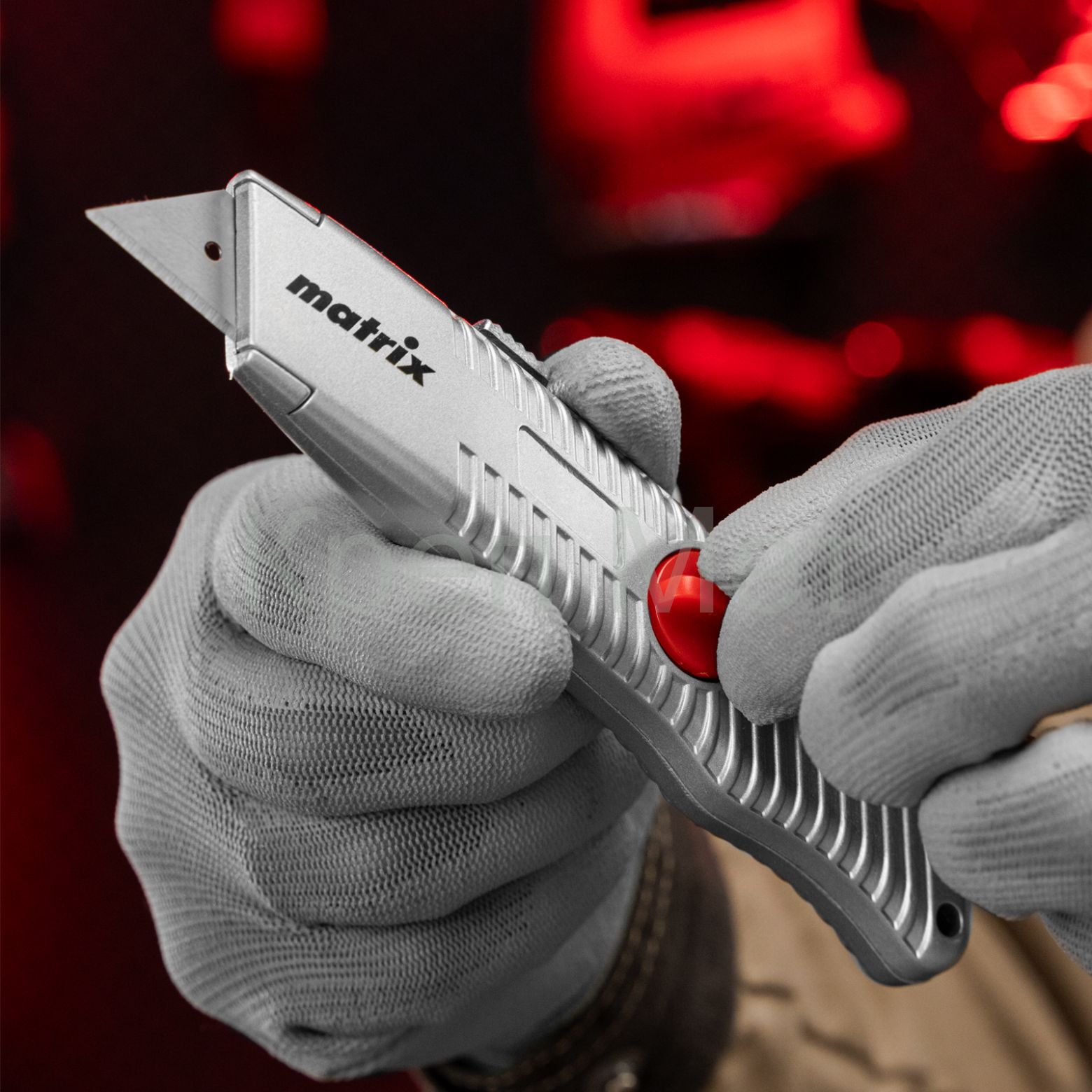 Нож Matrix 78964 в металлическом корпусе, с выдвижным трапециевидным лезвием, применяется при резке бумаги, картона, кожи, а также для раскройки линолеума или обоев. Инструмент успешно справляется с этой работой благодаря стальному лезвию шириной 19 мм. Используется в профессиональной сфере и в быту.