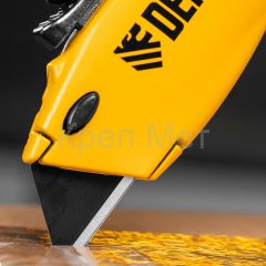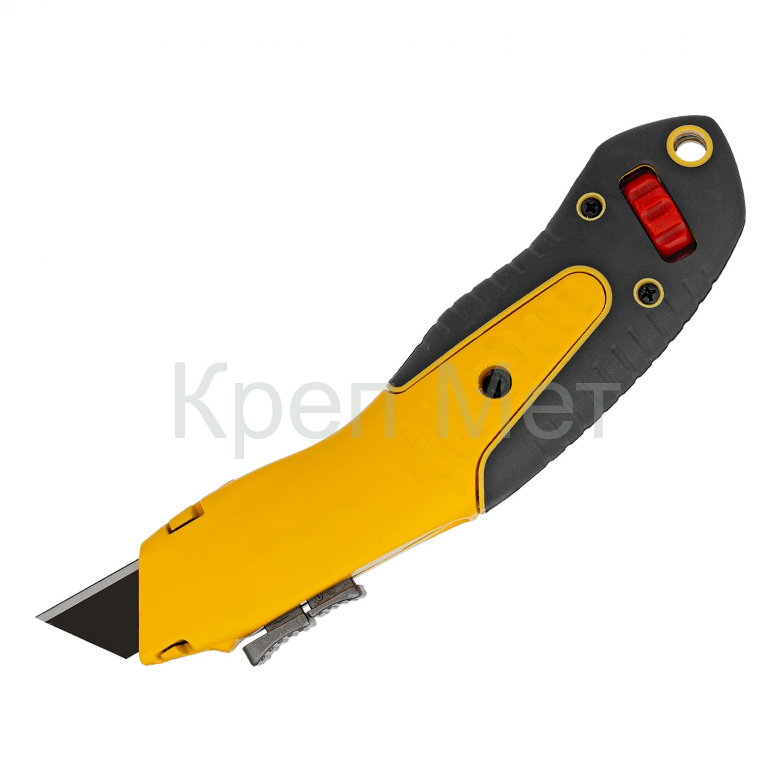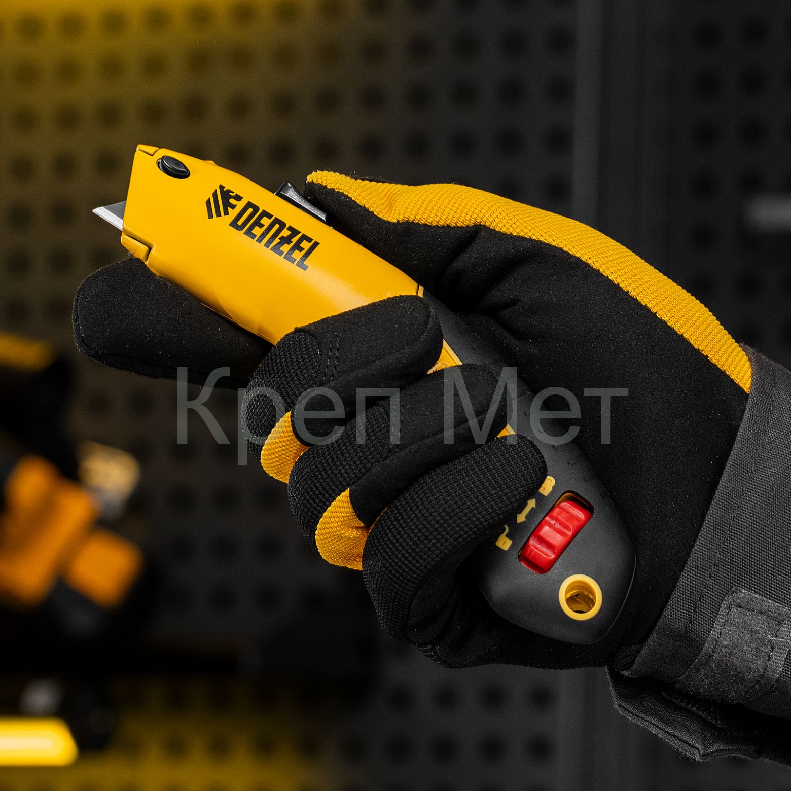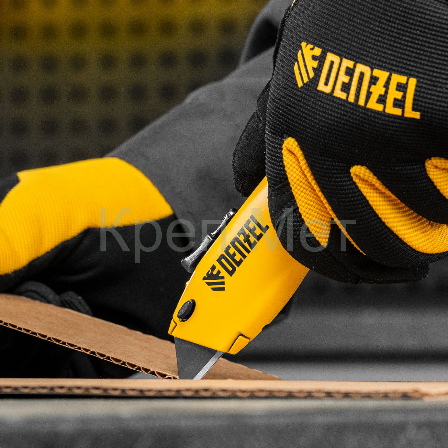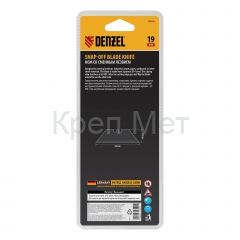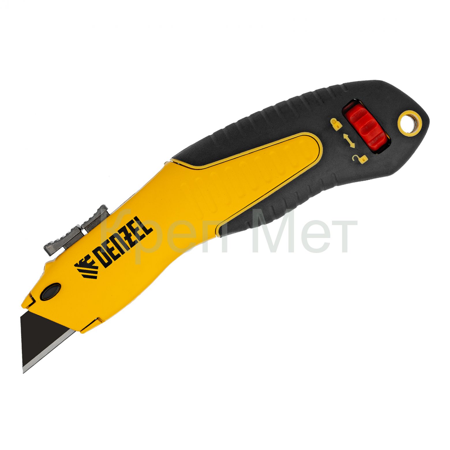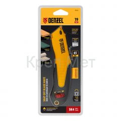 - Нож, 19мм, сменное трапециевидное лезвие, SK4, алюминиевый корпус, торцевой зажим Denzel