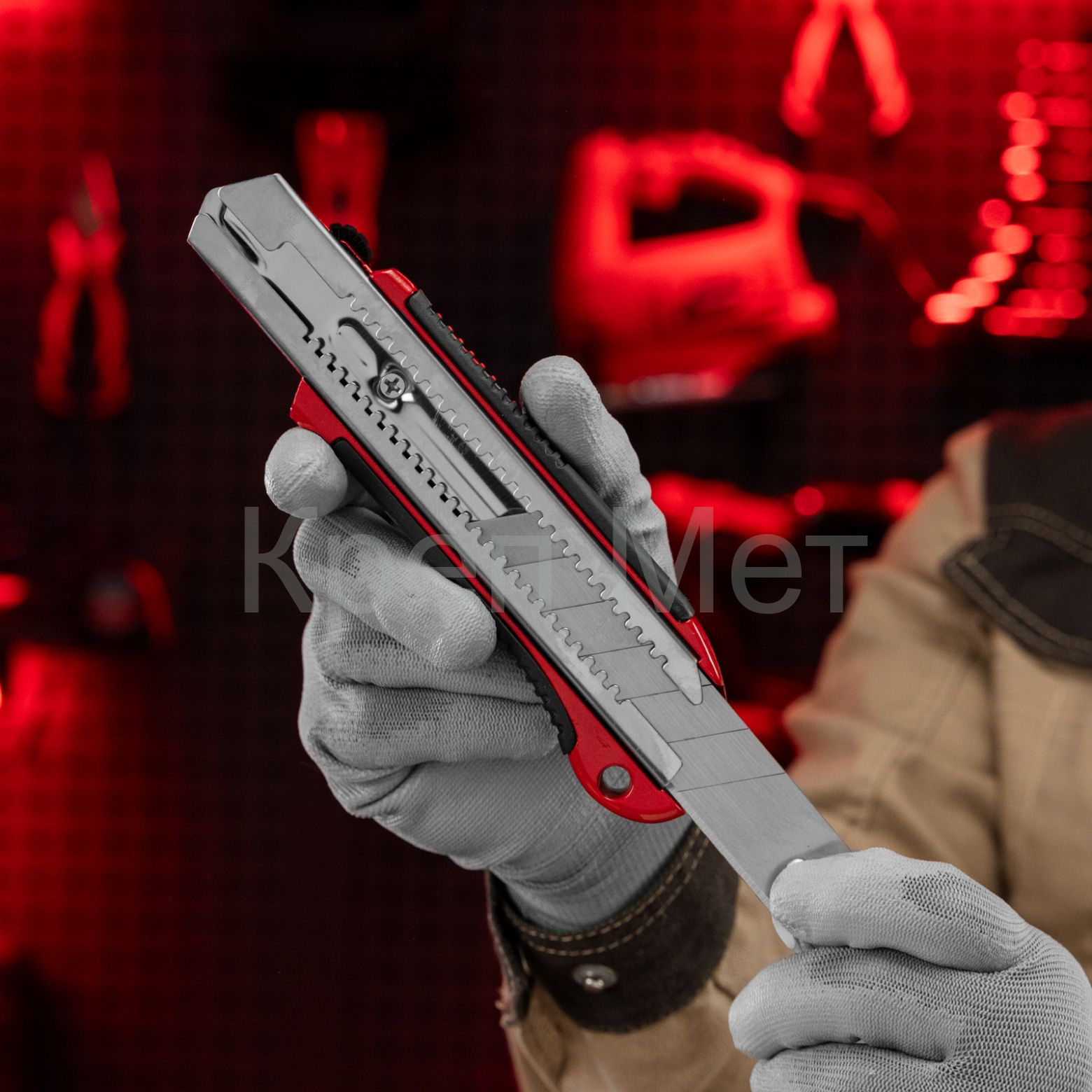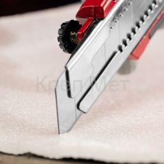 Нож Matrix 78959 с выдвижным лезвием шириной 25 мм, усиленной металлической направляющей и металлической обрезиненной ручкой служит для резания бумаги, картона, линолеума, обоев и других материалов. Благодаря усиленной направляющей нож не сломается даже при значительных нагрузках. Предусмотрена возможность ручной замены износившегося лезвия. Инструмент используется для проведения строительных работ, также полезен в быту.