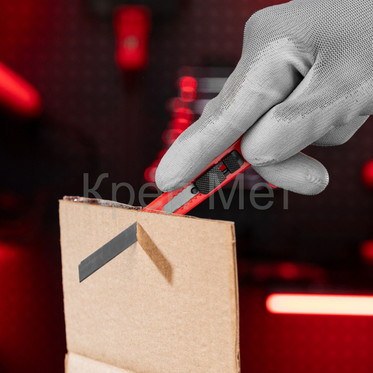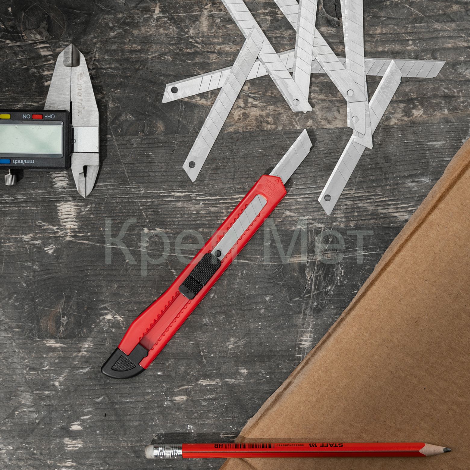 Нож Matrix 78911 с выдвижным лезвием шириной 9 мм способен резать картон, обои, скотч, бумагу и другие материалы, не требующие больших усилий. Будет полезен во время ремонта, при вскрытии упаковок, а также пригодится для решения бытовых задач. Благодаря выдвижному лезвию можно установить оптимальную длину режущей части в зависимости от толщины материала.