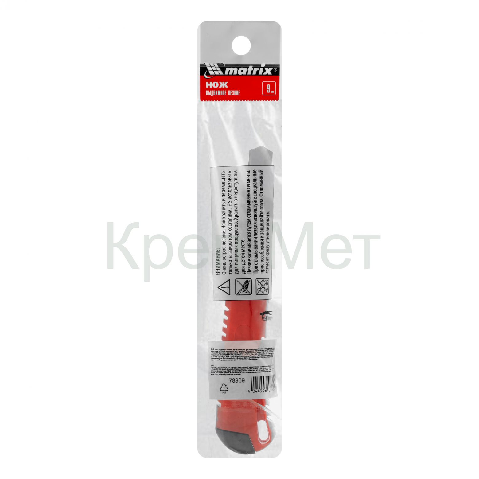 Нож Matrix 78909 с выдвижным лезвием шириной 9 мм и металлической направляющей подходит для профессионального и бытового использования. С его помощью можно разрезать картон, бумагу, скотч, кожу или обои. Инструмент прослужит долго, т.к. металлическая направляющая увеличивает его прочность.