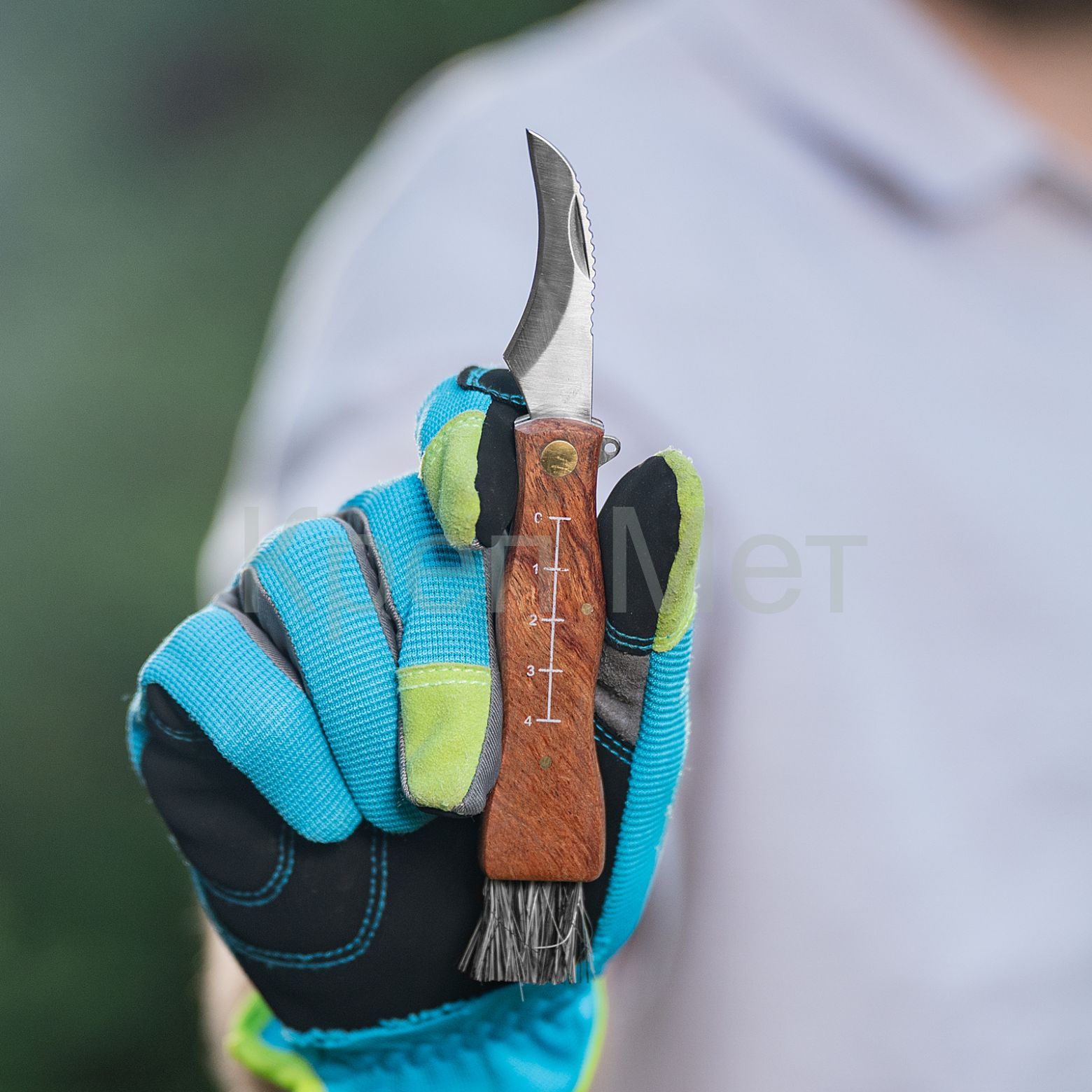 - Специальные зазубрины на верхней кромке лезвия помогают очистить ножки грибов от земли и грязи.