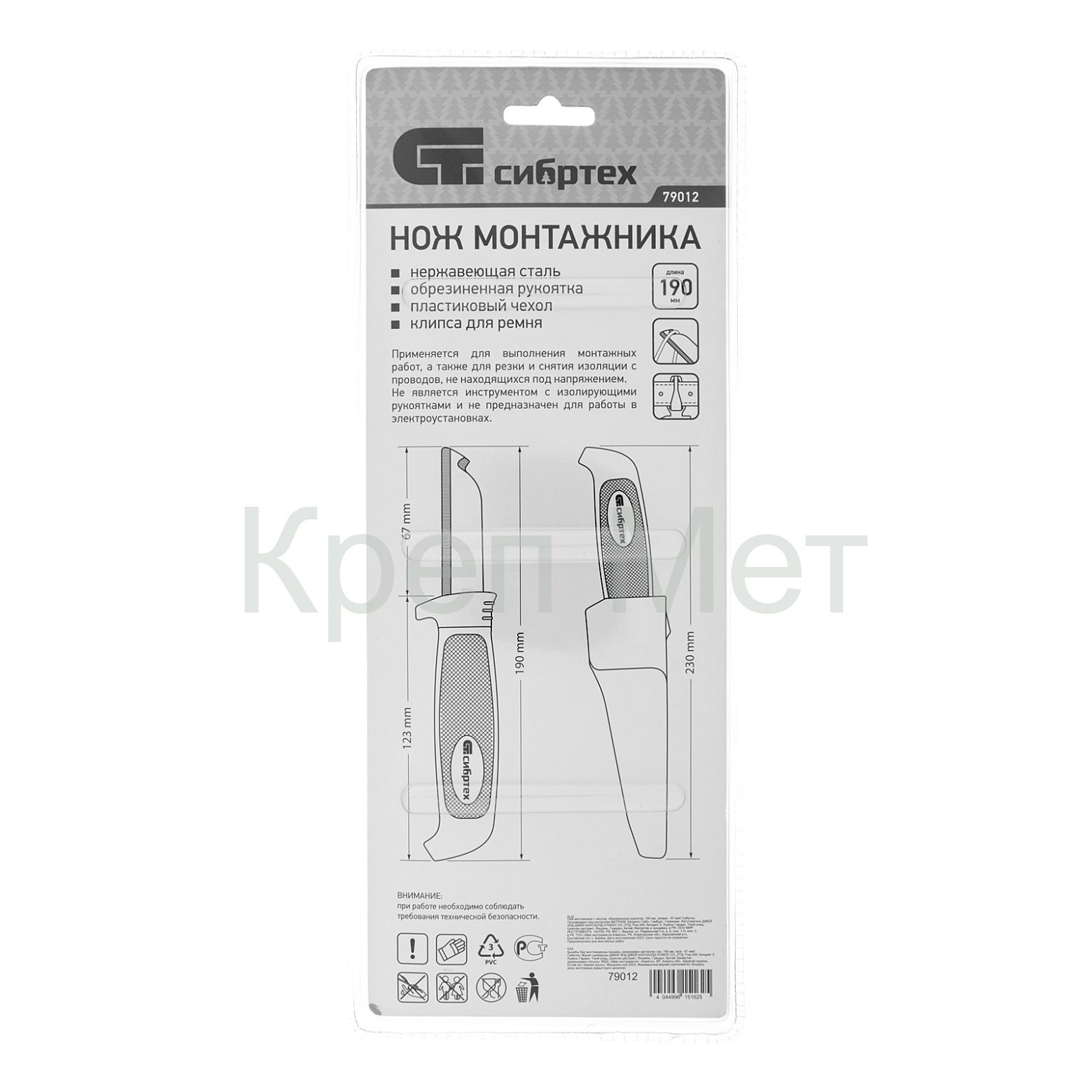 Нож монтажника с чехлом, обрезиненная рукоятка, 190 мм, лезвие 67 мм Сибртех
