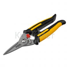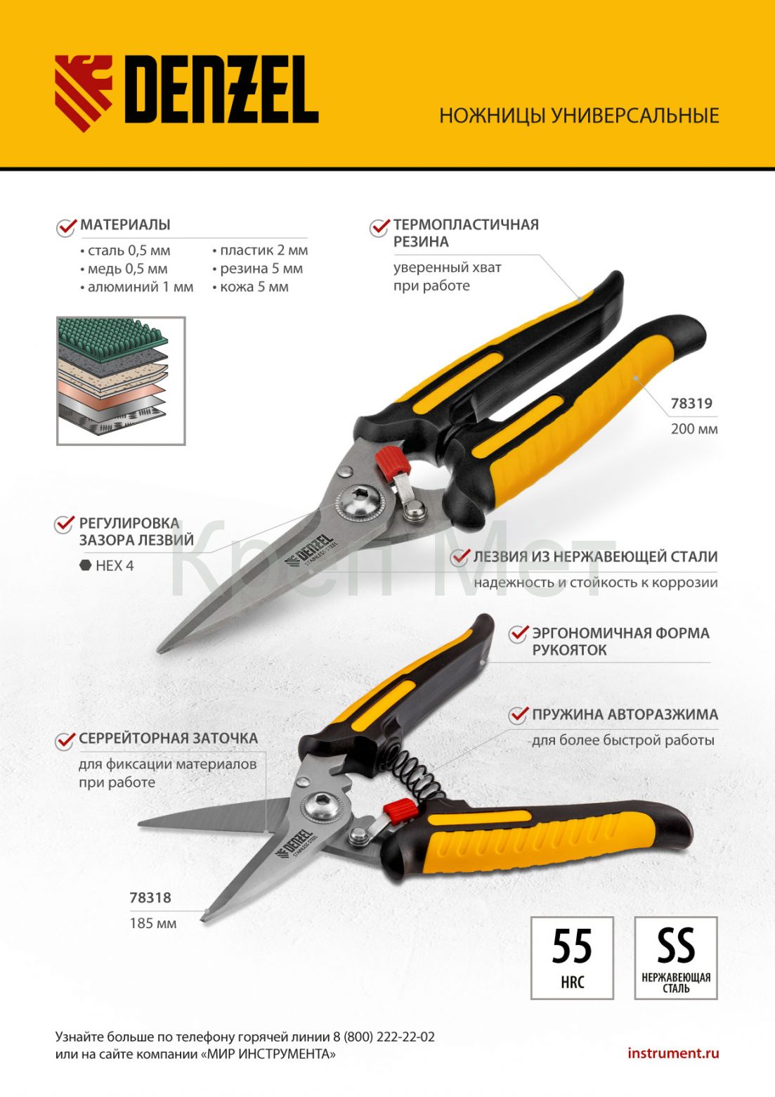 Универсальные ножницы Denzel 78318 длиной 185 мм — инструмент для разрезания тонкого металла и мягких материалов. Одно из лезвий имеет серрейторную (зубчатую) заточку, поэтому разрезаемый материал не выскальзывает из инструмента. Ножницы подходят для выполнения разнообразных работ: на даче помогут разрезать стальную сетку с небольшим диаметром проволоки, в походе — ветки или рыбу, во время мелкого ремонта или занятий творчеством — провода, кожу, резину, картон, бумажную лозу и другие материалы.