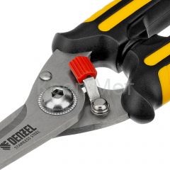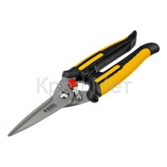 Универсальные ножницы Denzel 78319 длиной 200 мм — инструмент для разрезания тонкого металла и мягких материалов. Одно из лезвий имеет серрейторную (зубчатую) заточку, поэтому разрезаемый материал не выскальзывает из инструмента. Ножницы подходят для выполнения разнообразных работ: на даче помогут разрезать стальную сетку с небольшим диаметром проволоки, в походе — ветки или рыбу, во время мелкого ремонта или занятий творчеством — провода, кожу, резину, картон, бумажную лозу и другие материалы.