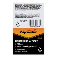 Ножовка по металлу Sparta 775865 с полотном длиной 300 мм и пластмассовой рукояткой используется для резки металлических, пластмассовых и деревянных заготовок. Поворотные крепления позволяют установить полотно под углом 90° для продольного распила длинных заготовок. Ножовка оптимальна для бытового применения.