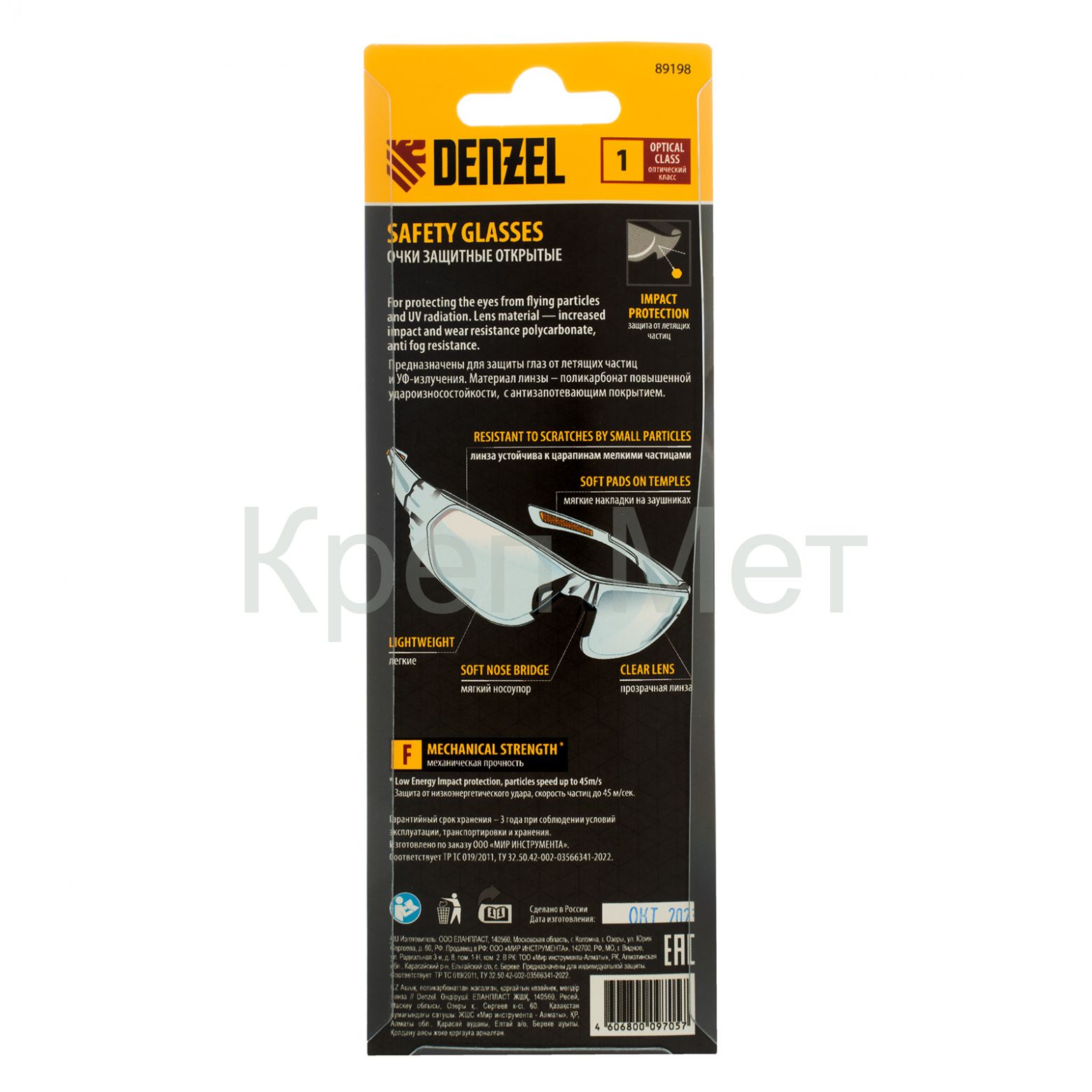 Очки защитные открытые Denzel 89198 с поликарбонатными прозрачными линзами предназначены для защиты глаз от механических повреждений и УФ-излучения. Очкам присвоен класс механической прочности F, они обеспечивают защиту от высокоскоростных частиц с низкоэнергетическим ударом (скорость частиц до 45 м/с). Легкие универсальные очки используются во время работы с электро- и бензоинструментом, на производстве и в быту.