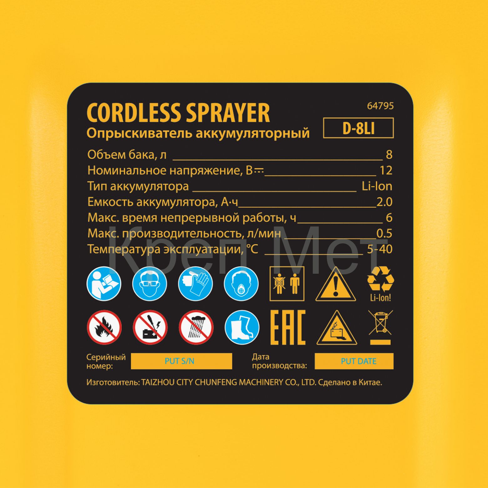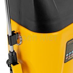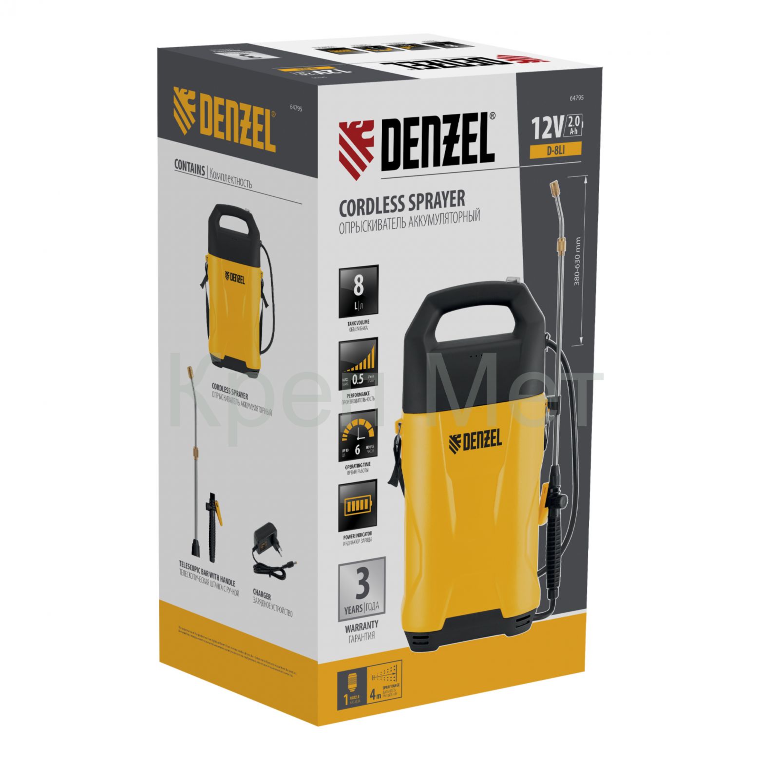 Аккумуляторный опрыскиватель Denzel D-8LI 64795 с баком объемом 8 л и Li-Ion батареей на 12 В, емкостью 2 А·ч, используется для ухода за растениями, а также для распыления инсектицидных жидкостей, дезинфекции помещений, мытья окон, стен и дорожек. Длина штанги регулируется в диапазоне 380-630 мм, а максимальная дальность распыления составляет 4 м, что позволяет обрабатывать участки большой площади и труднодоступные места. Опрыскиватель экономит силы и время пользователя, будет полезен в быту и на производстве.