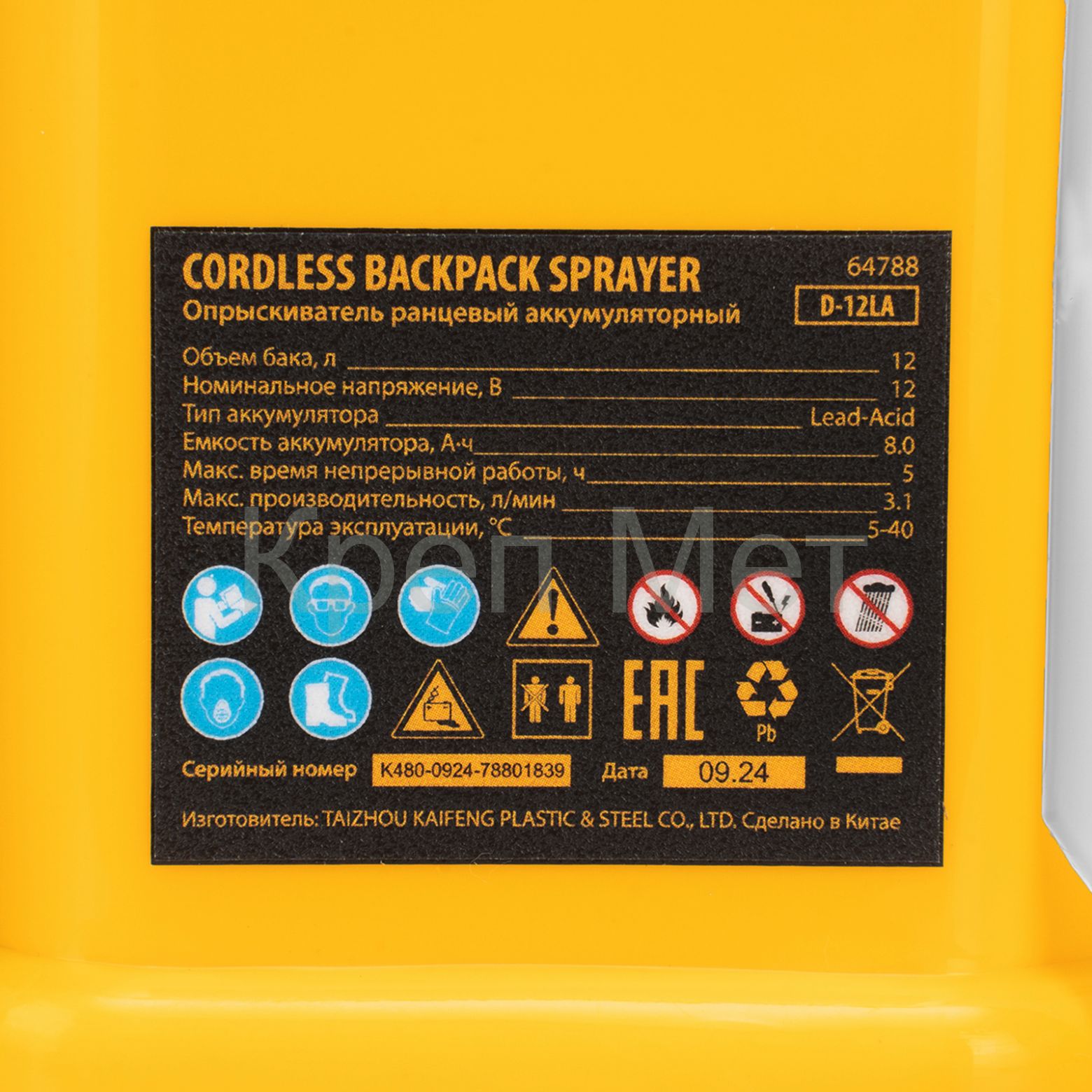 - Опрыскиватель ранцевый аккумуляторный D-12LA, 12 л, 12 В, 8 Ач Denzel