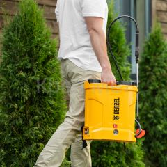 - Бесперебойная работа — полного заряда аккумулятора хватает на 4 часа работы, что в сочетании с вместительным баком позволяет обрабатывать участки большой площади без перерывов на дозаправку и подзарядку.