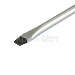 - Твердость и прочность обеспечивается высоким качеством материалов: стержень выполнен из стали CrV, а жало — из закаленной инструментальной стали S2.