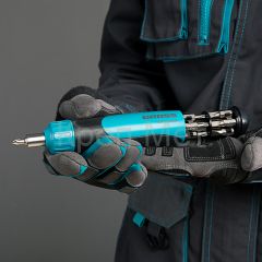 Реверсивная отвертка Gross 11611 с механизмом Smart Push комплектуется 12 битами из стали S2 с хвостовиком 1/4 дюйма для работы с крепежом типа PH, SL и TORX. За счет реверсивного механизма повышается скорость проведения работ. Отвертка универсальна, т.к. с ней можно использовать любые биты длиной 25 мм с хвостовиком 1/4 дюйма. Она будет полезна не только частным мастерам, но и профессионалам.