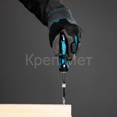 - Компактное хранение и транспортировка — биты и удлинитель помещаются в специальную полость внутри рукоятки.