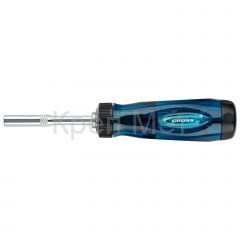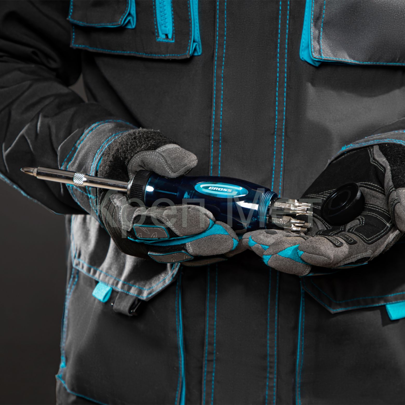 Реверсивная отвертка Gross 11603 с удлинителем и трещоткой на 72 зуба комплектуется 12 сменными битами из стали S2 для эффективной работы с саморезами, винтами и другим крепежом. Она пригодится при проведении монтажных, строительных, ремонтных работ. Для расширения возможностей отвертки можно использовать любые биты длиной 25 мм с хвостовиком 1/4 дюйма.