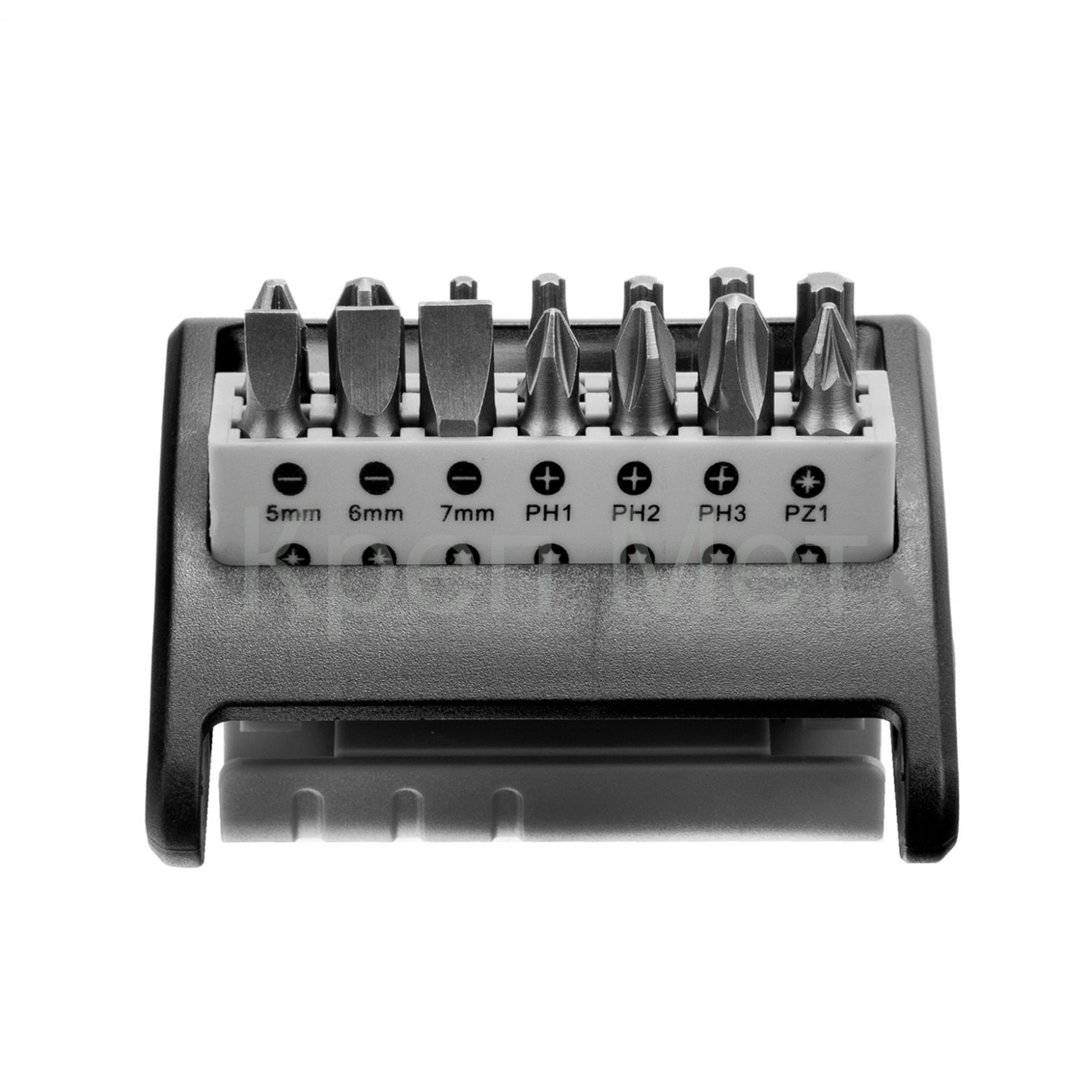 - Быстрый поиск нужной насадки — на держателе имеются обозначения размеров и типов шлицев.
