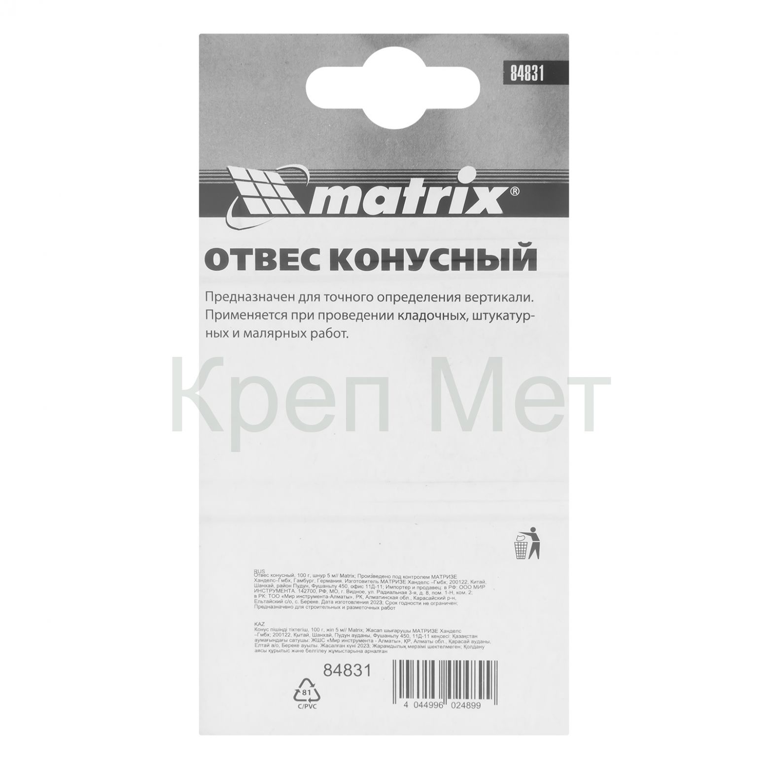 Конусный отвес Matrix 84831 массой 100 г, в комплекте со шнуром 5 м, используется для определения ровности или наличия отклонений у вертикальной плоскости. Корпус в форме конуса способствует отличной центровке.