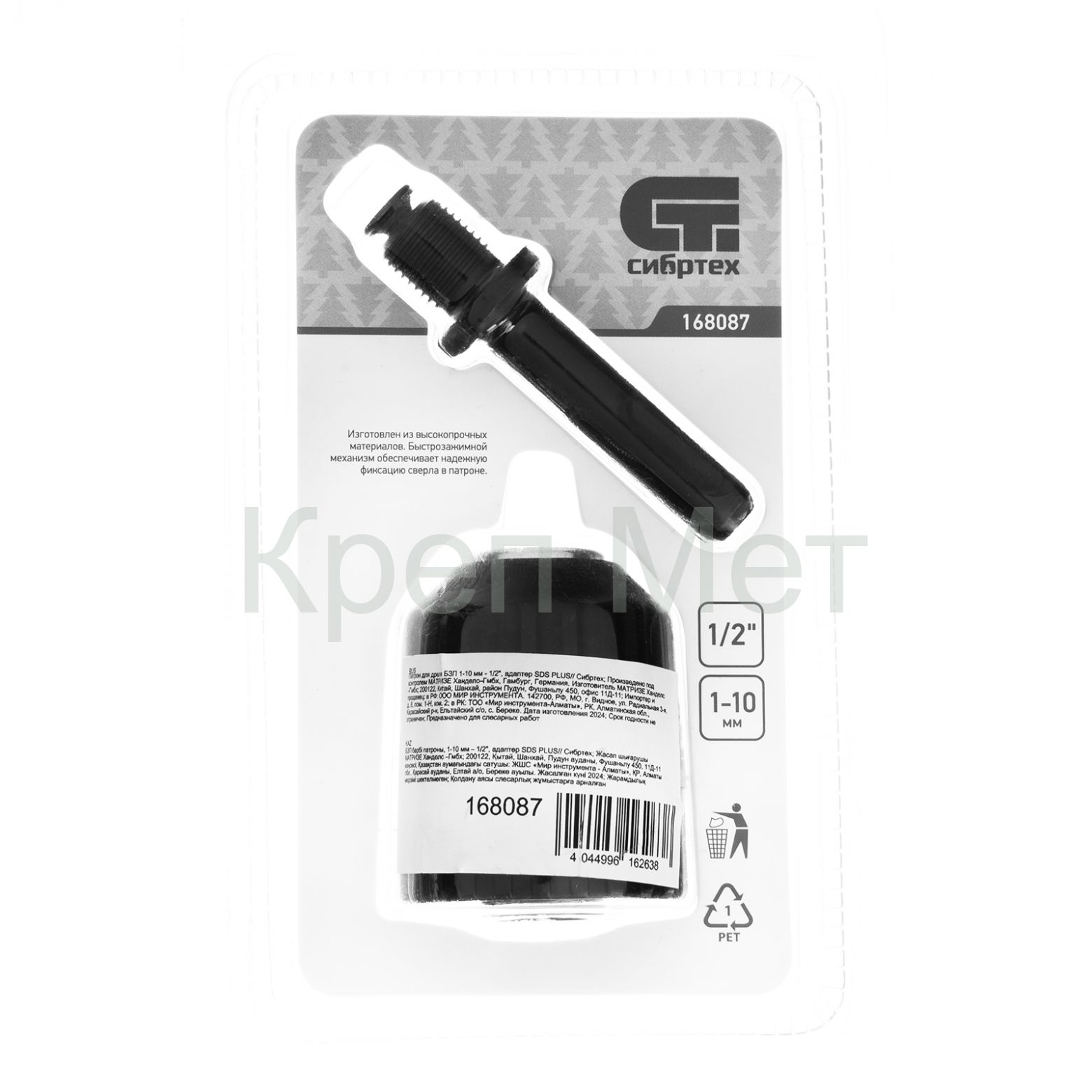 Патрон Сибртех БЗП 168087, тип соединения 1/2 дюйма, под сверла 1-10 мм, с адаптером SDS PLUS в комплекте, предназначен для использования с дрелью. Он надежно фиксирует оснастку, что обеспечивает комфортную работу. А благодаря переходнику SDS PLUS возможна работа с перфоратором.