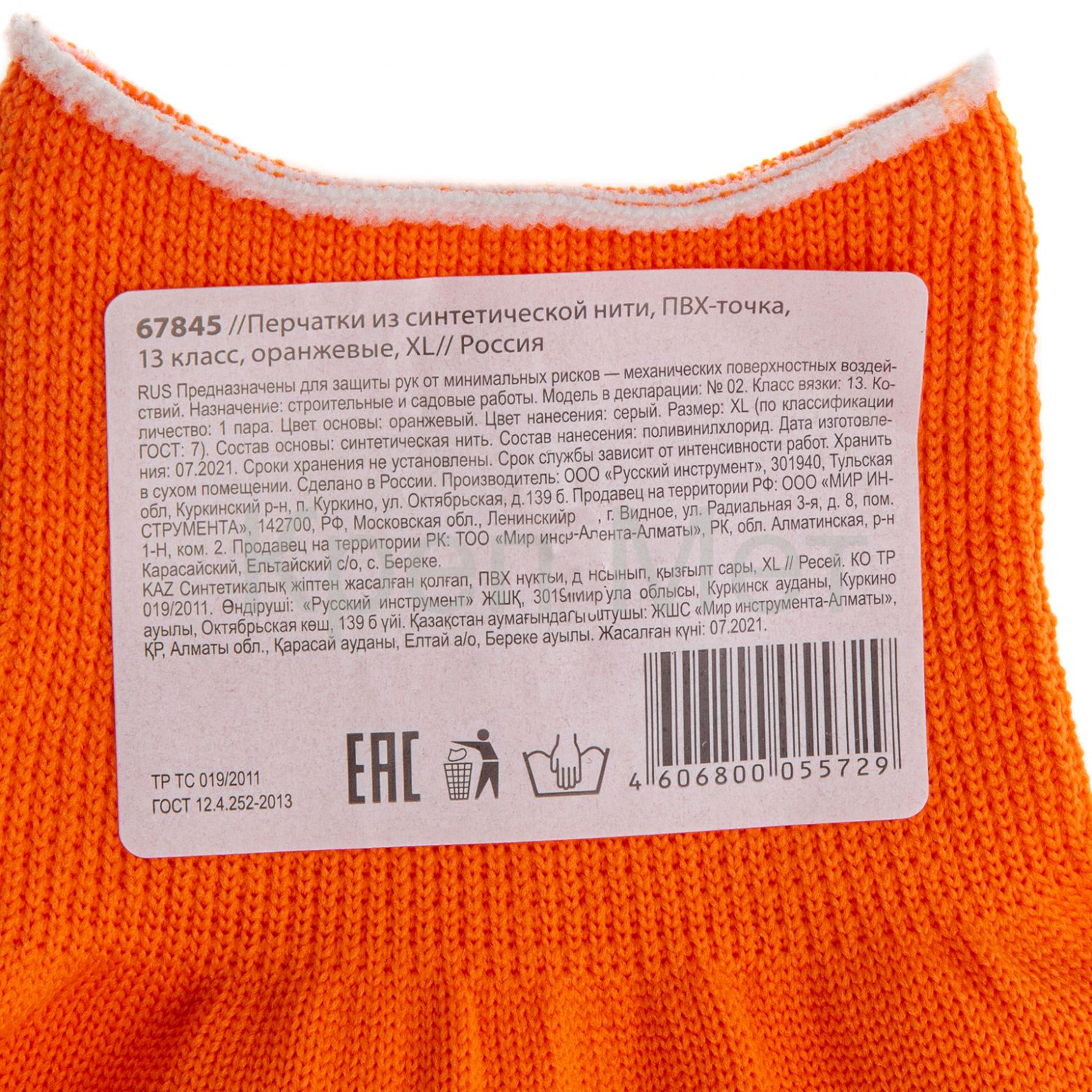 Оранжевые перчатки из синтетической нити 67845 с ПВХ точкой, 13 класс вязки, размера XL, применяются для защиты рук от царапин и ссадин. Они станут незаменимым помощником при осуществлении строительных, ремонтных, садовых и других работ. Плотная ткань из тонких синтетических нитей сохраняет высокую чувствительность пальцев, что особенно актуально при проведении точных работ.