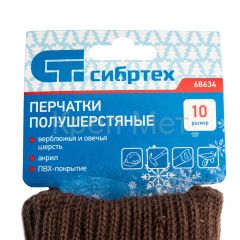Двойные трикотажные полушерстяные перчатки Сибртех 68634 с ПВХ-покрытием защищают руки работника от механических повреждений и общепроизводственных загрязнений. Внешняя перчатка изготовлена из полиакрилонитрила (ПАН). В состав пряжи внутренней перчатки входит ПАН — 42%, верблюжья шерсть — 15%, овечья шерсть — 43%. Покрытие из ПВХ обеспечивает надежное сцепление с поверхностью и удобный хват во время работы с различными предметами. Перчатки используются во время выполнения тяжелых строительных, механосборочных, такелажных и монтажных работ в неотапливаемых помещениях и в холодное время года.