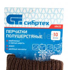 Двойные трикотажные полушерстяные перчатки Сибртех 68633 защищают руки работника от механических повреждений и общепроизводственных загрязнений. Внешняя перчатка изготовлена из полиакрилонитрила (ПАН). В состав пряжи внутренней перчатки входит ПАН — 42%, верблюжья шерсть — 15%, овечья шерсть — 43%. Перчатки используются во время выполнения тяжелых строительных, механосборочных, такелажных и монтажных работ в неотапливаемых помещениях и в холодное время года.