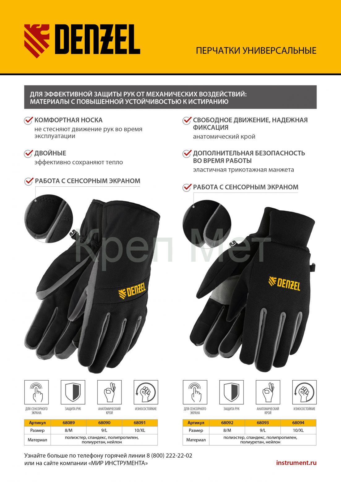 Универсальные двойные перчатки Denzel 68089 размера 8 защищают руки от механических воздействий и общепроизводственных загрязнений. Подходят для работы с сенсорным экраном — благодаря специальным накладкам на указательном и среднем пальцах можно не снимать перчатки, чтобы воспользоваться смартфоном. Перчатки пригодятся во время проведения строительных и ремонтных работ.