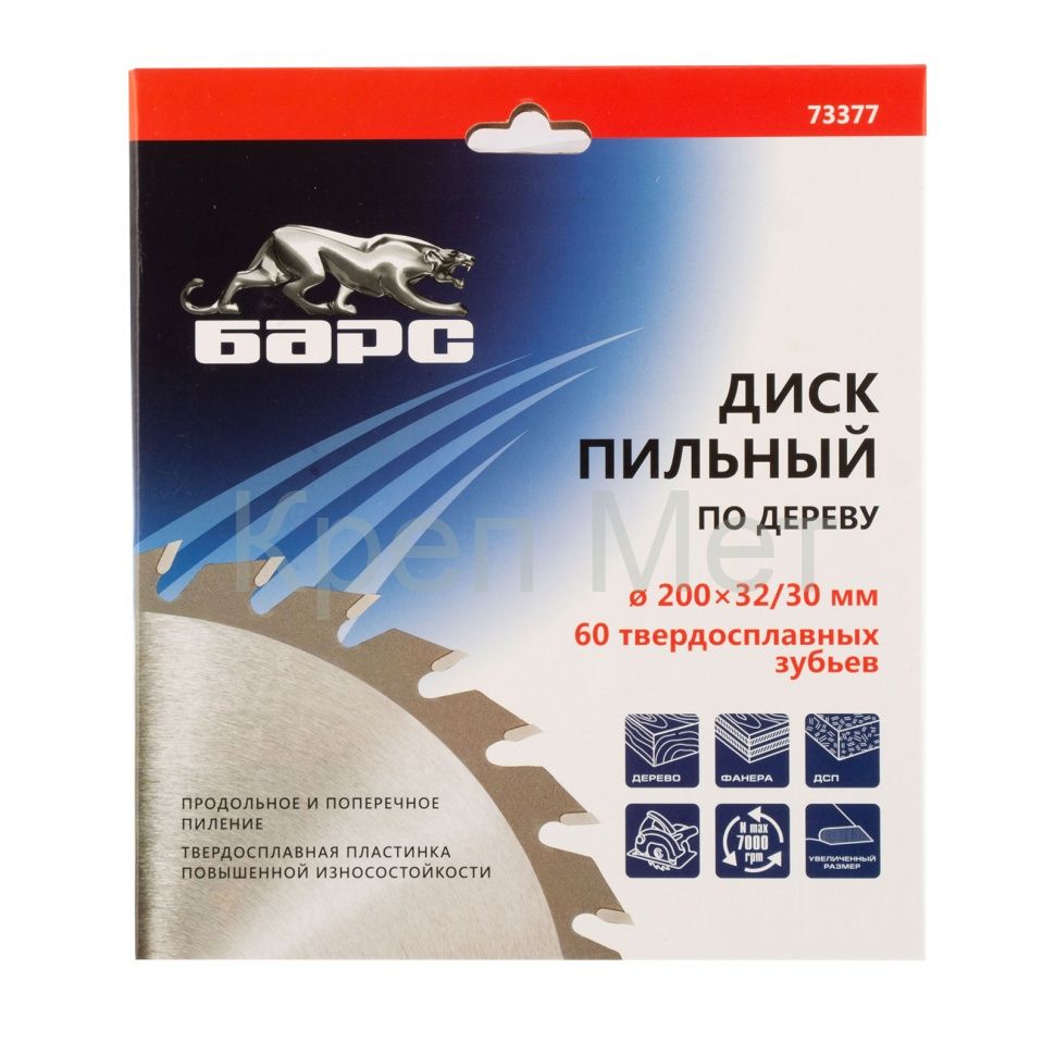 Пильный диск Барс 73377 диаметром 200 х 32 мм, с 60 зубьями и кольцом 32/30 мм, предназначен для точного и чистого пиления древесины мягких и твердых пород, ДСП, МДФ и фанеры. Мелкие зубья типа АТВ и оптимально подобранный угол зуба позволяют производить качественный поперечный распил. Диск используется совместно с торцовочными и циркулярными пилами с посадкой 32 мм. В комплект входит переходное кольцо на диаметр 30 мм, расширяющее возможности применения оснастки. Диск подходит для интенсивной эксплуатации и может использоваться в профессиональной сфере.