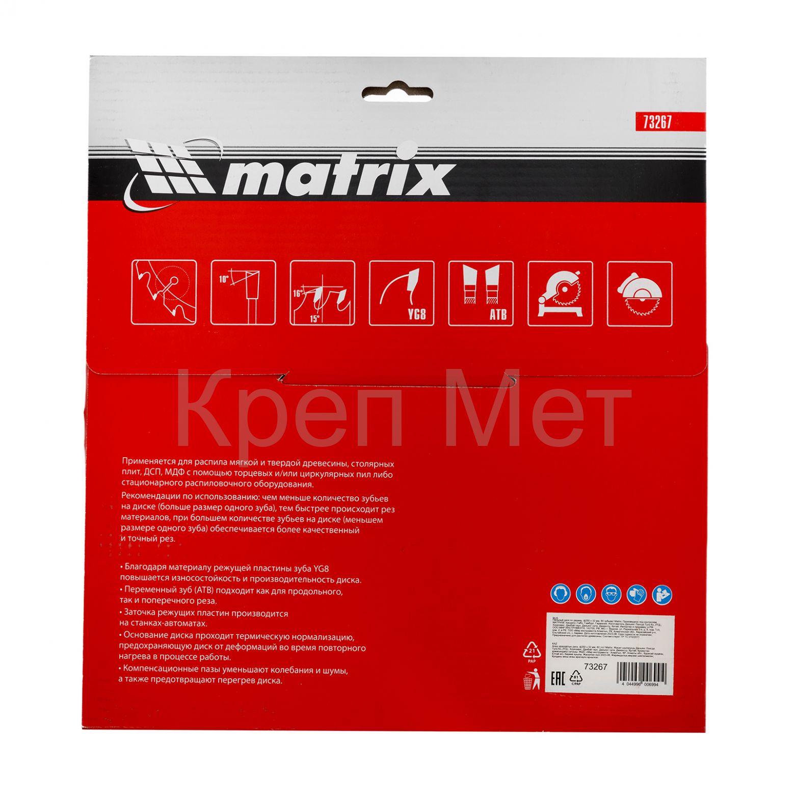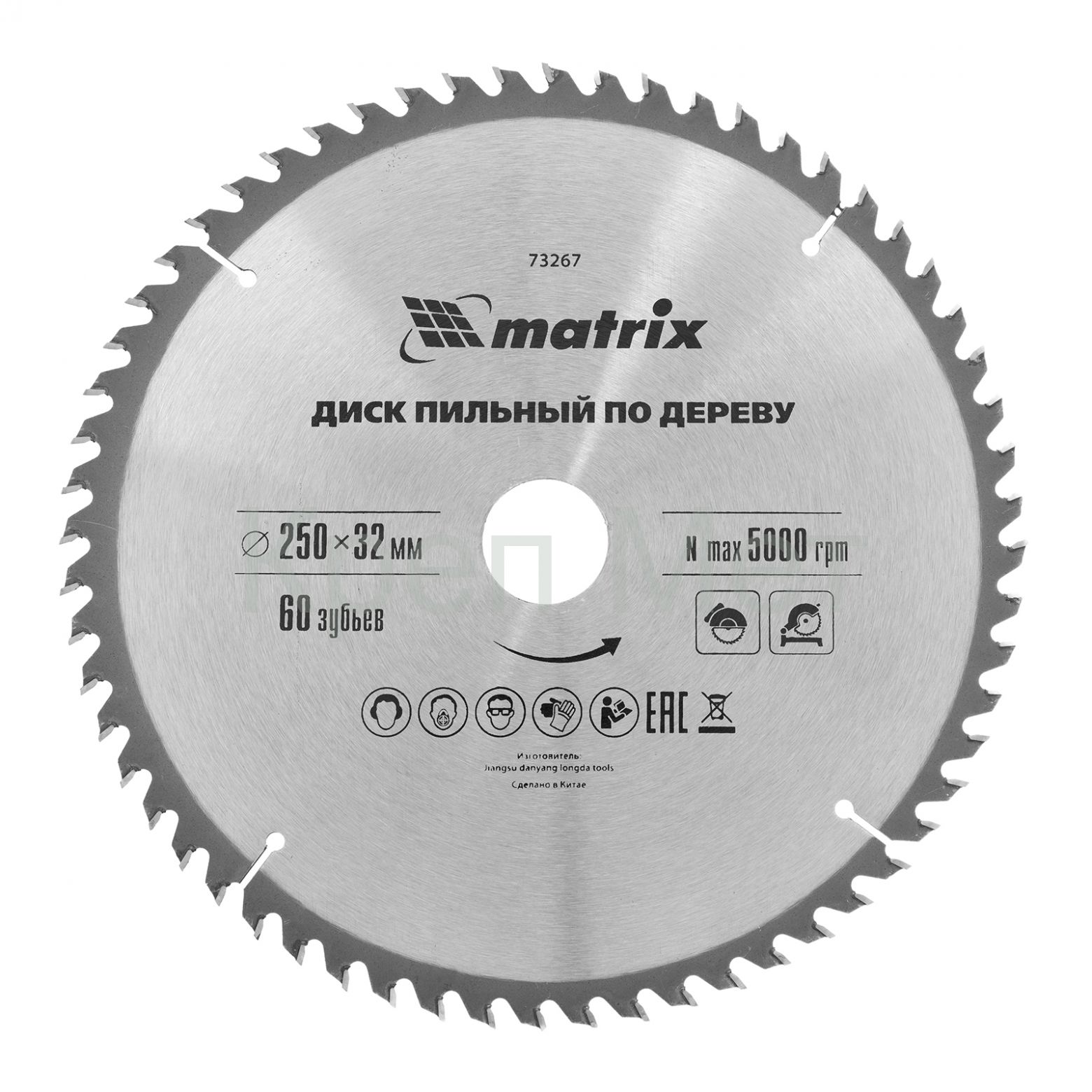 Пильный диск по дереву Matrix 73267 диаметром 250 х 32 мм, с 60 зубьями, — оснастка для циркулярных и торцовочных пил с соответствующим посадочным и внешним диаметром. Используется преимущественно для поперечного реза материалов из мягкой и твердой древесины, ДСП, ДВП, фанеры, столярных плит. Диск подходит для бытового и профессионального применения.